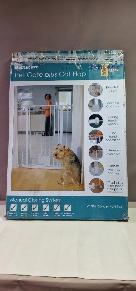 Dimensiones: Ancho ajustable: 75-84 cm Alto: 104 cm Puerta para gatos: 17 x 17 cm Ancho entre listones: 6 cm