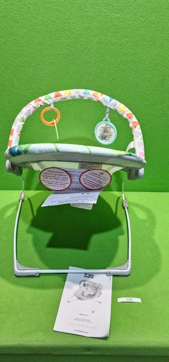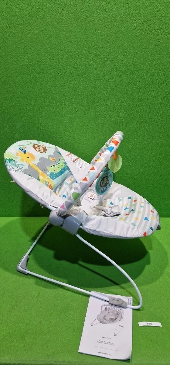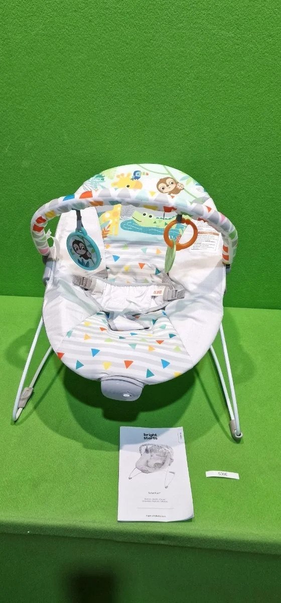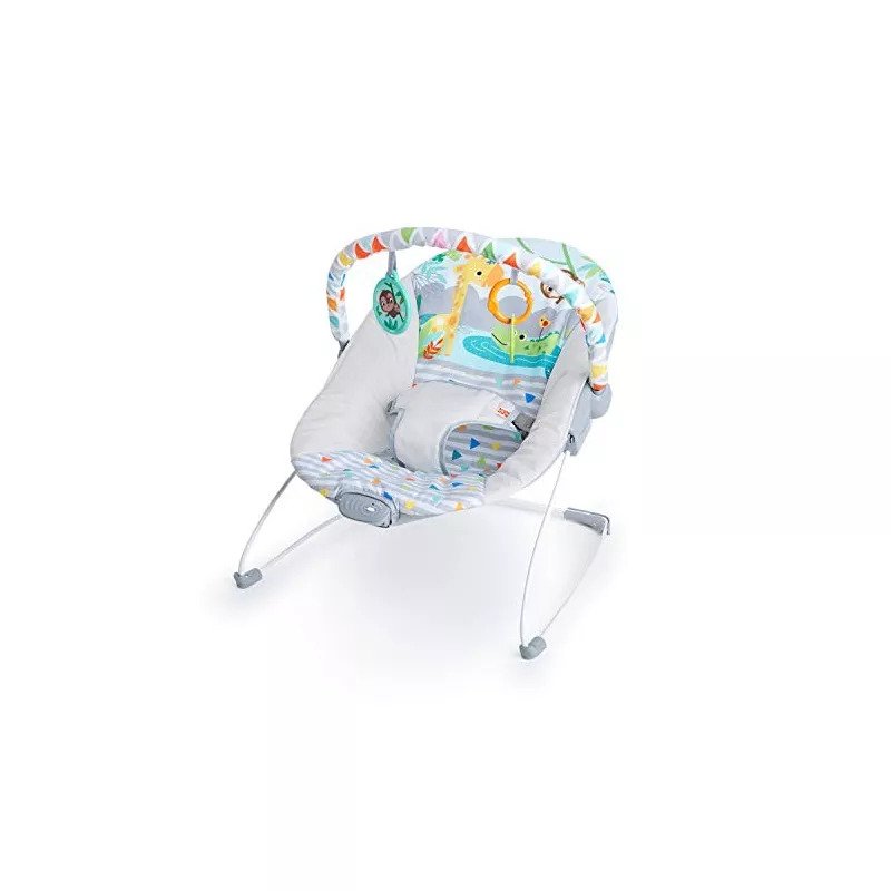 Bright Starts, Hamaca Mecedora para Bebé – Safari Fun, vibraciones relajantes, arco de juego con 2 juguetes, asiento lavable a máquina, arnés de 3 puntos, desde recién nacidos hasta los 9 kg