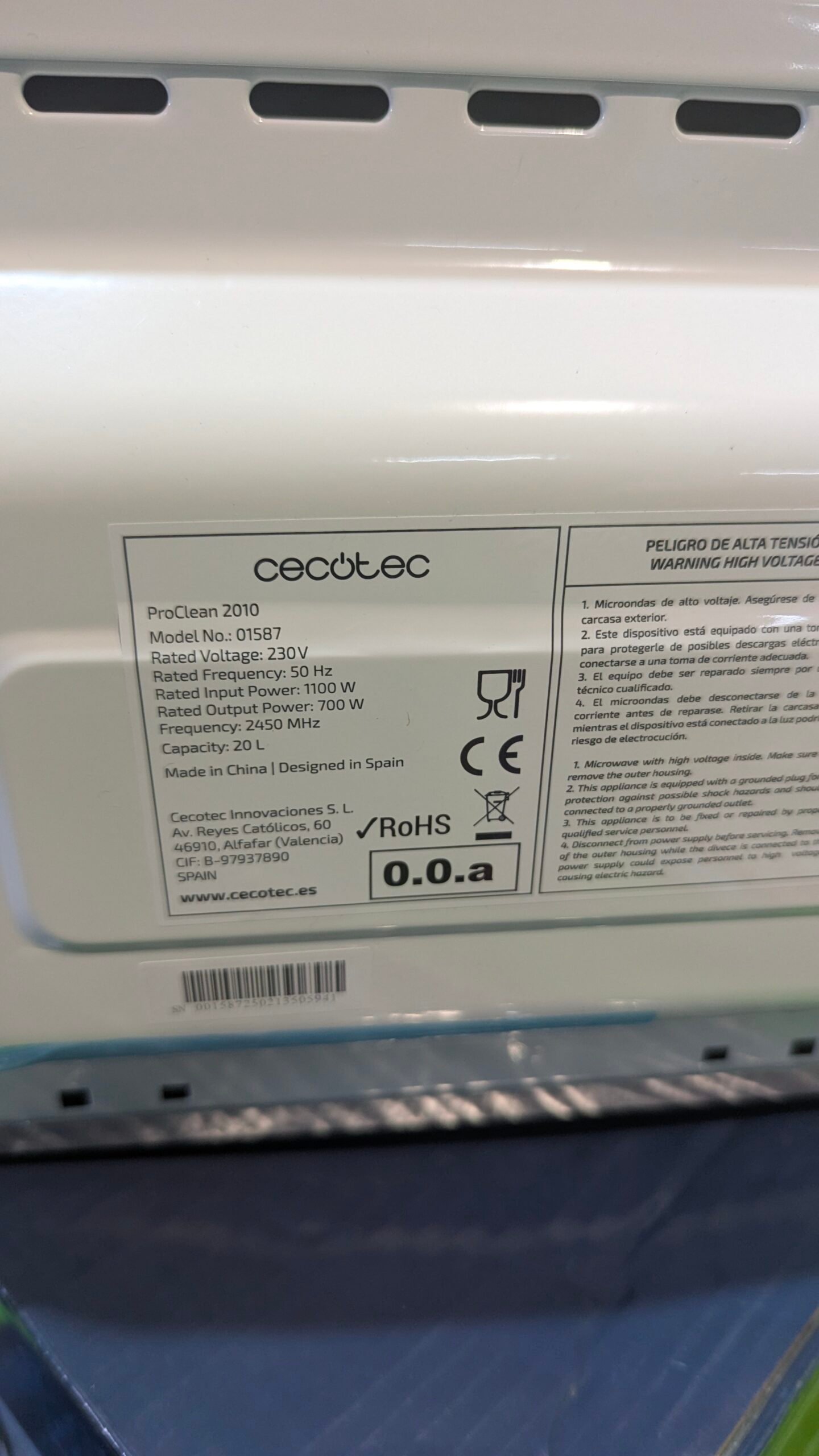 Cecotec Microondas ProClean 2010. 700 W de Potencia, 20L