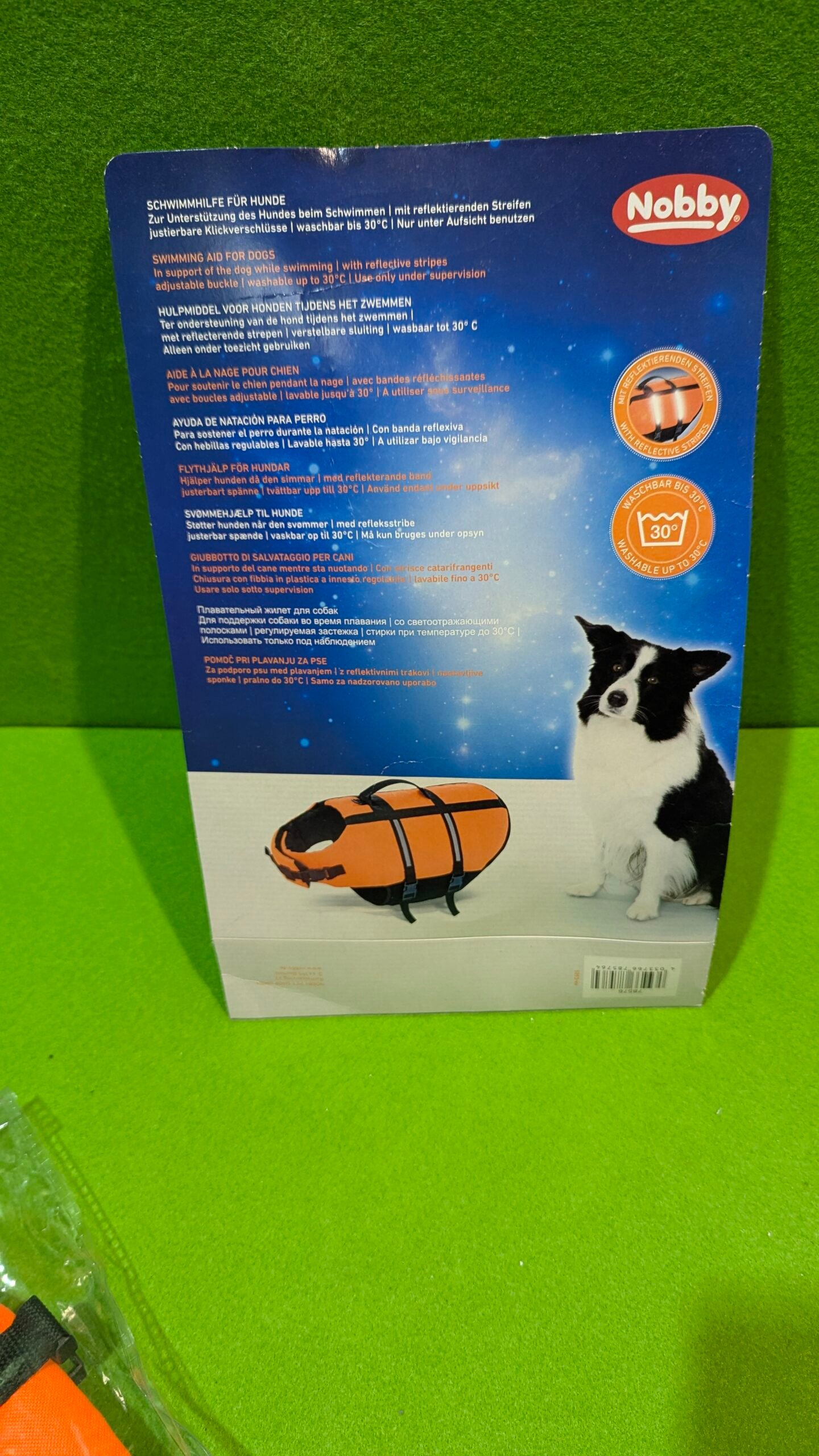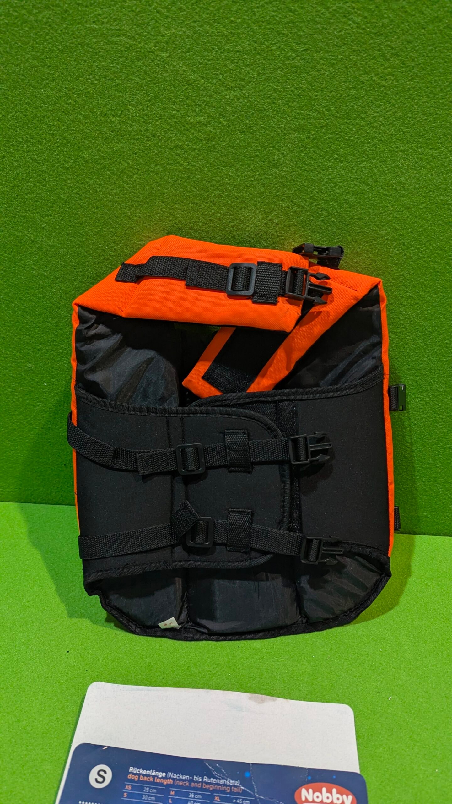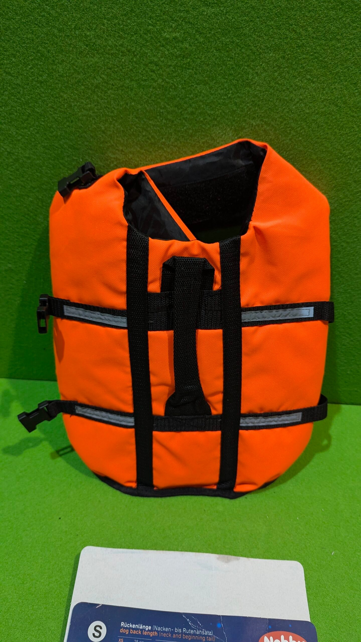 Chaleco salvavidas para perros en talla S, pensado para aportar flotabilidad y mejorar la visibilidad durante actividades en el agua. Acabado en color naranja con detalles reflectantes, incluye correas ajustables y asa superior para facilitar el agarre. Interior acolchado para mayor comodidad. Producto con 1 uso y entrega tal como se muestra en las imágenes.
