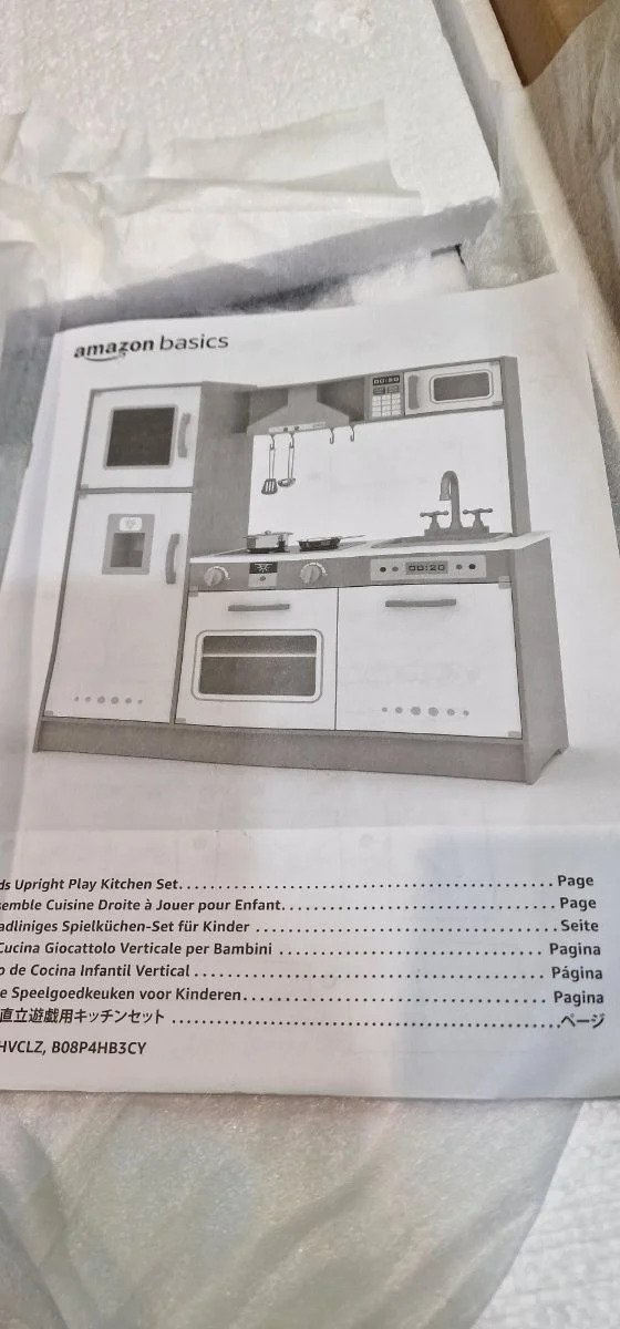 Amazon Basics – Cocina de juguete, disposición en línea, de madera, con puertas interactivas, pomos y luces, 99 x 30 x 89 cm, color blanco y gris Los accesorios incluyen una espátula de juguete metálica, un cazo, una olla con tapa y una sartén 👀
