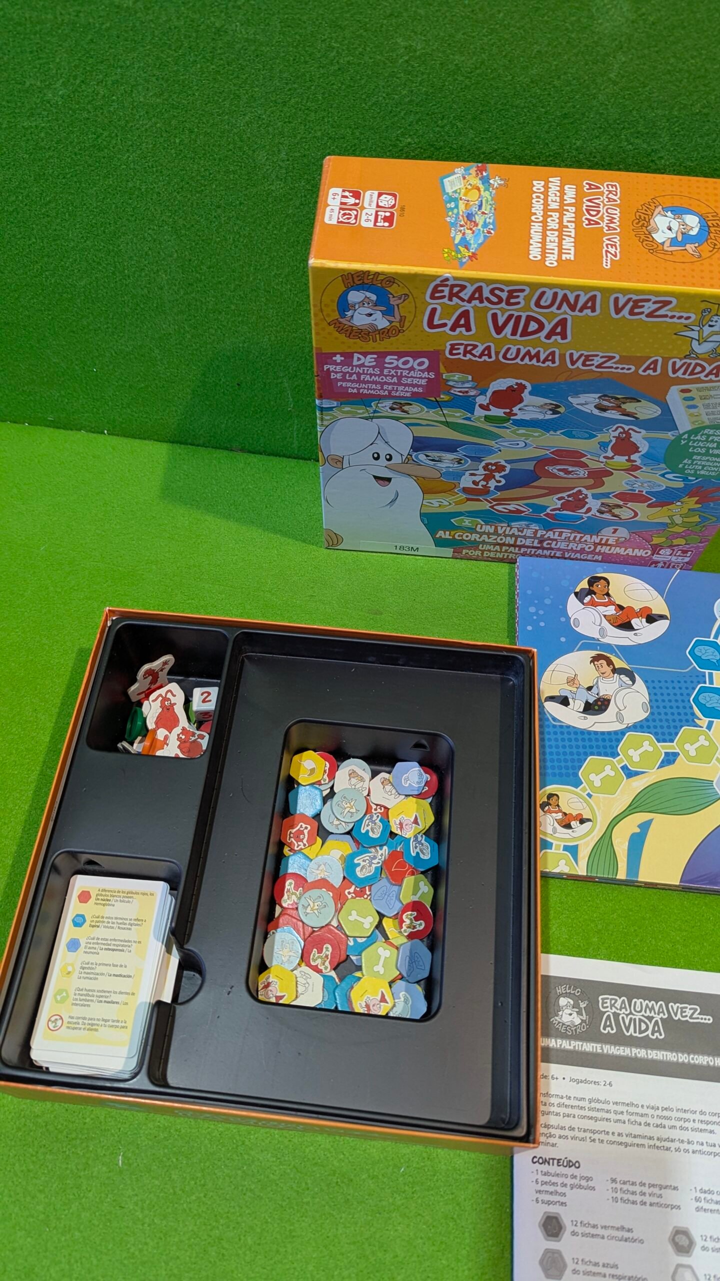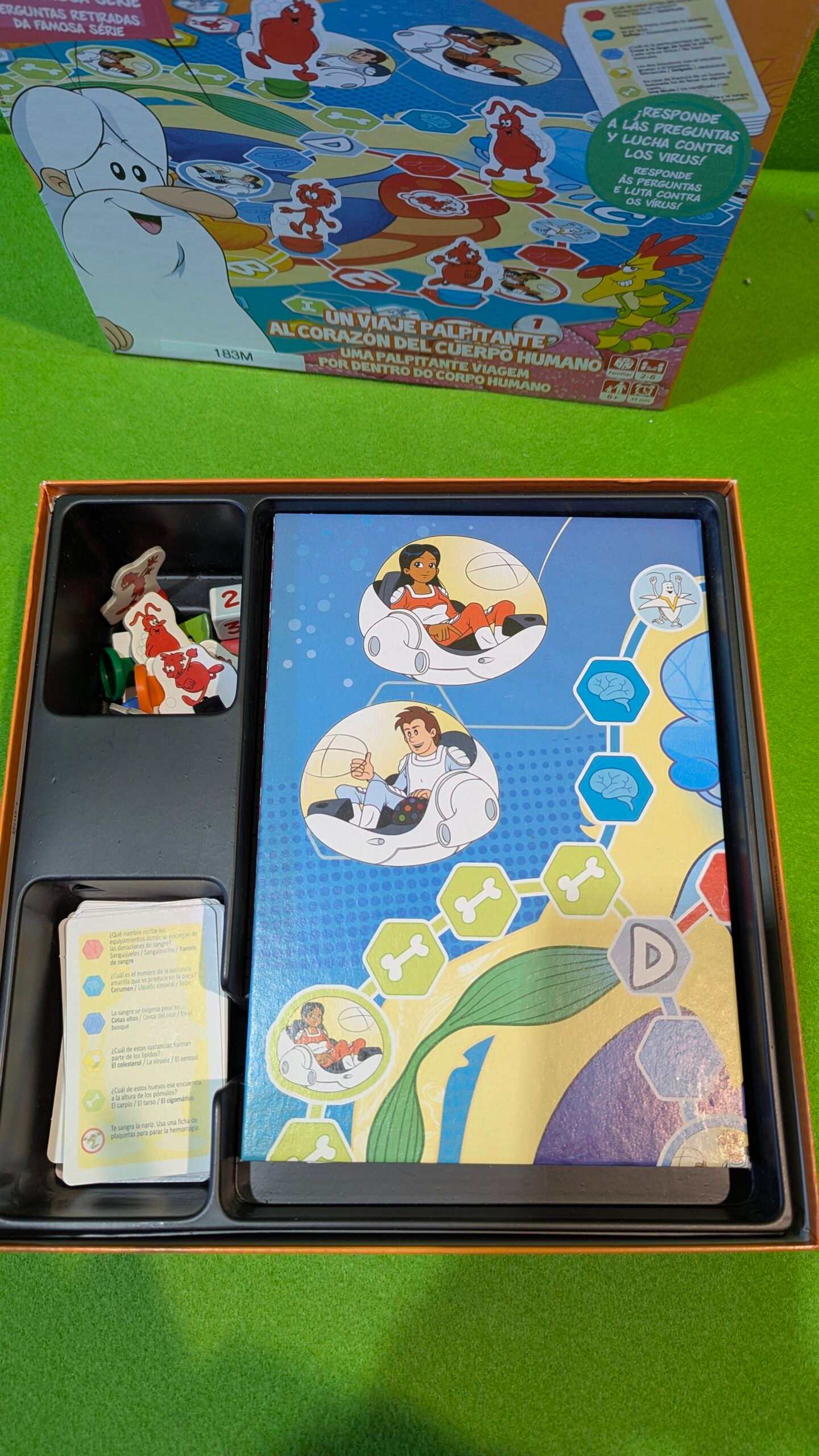 - Contiene: 1 tablero de juego, 1 dado, 96 cartas, 6 fichas de Glóbulo Rojo, 60 fichas de «Sistema», 10 fichas de «Virus», 10 fichas de «Anticuerpo»