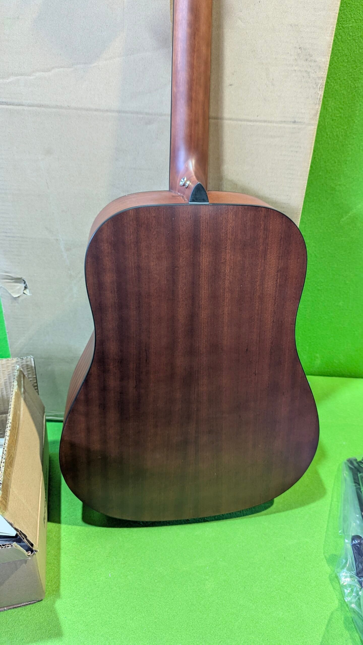 - Otras características destacadas incluyen la forma de cuerpo Dreadnought, clavijas selladas para una afinación precisa, un puente de nogal que optimiza la resonancia tonal, un acabado satinado suave y el binding en el cuerpo y mástil para una mayor durabilidad.