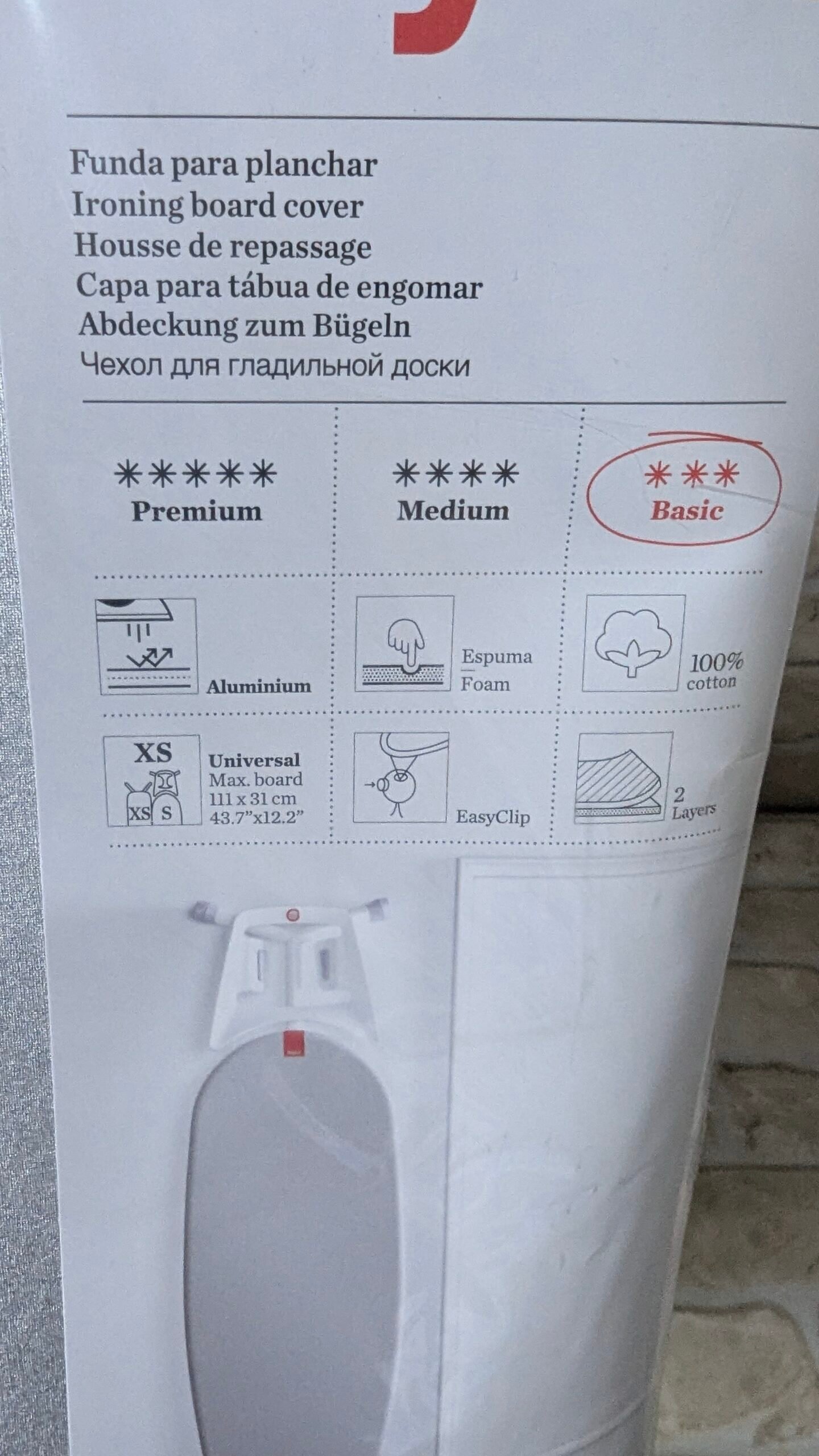 - Ajuste universal: fácil sistema de ajuste con clip para adaptarse perfectamente a todas las tablas de planchar. Puede utilizarse en tablas de 110 a 126 cm de largo y 30 x 40 cm de ancho.