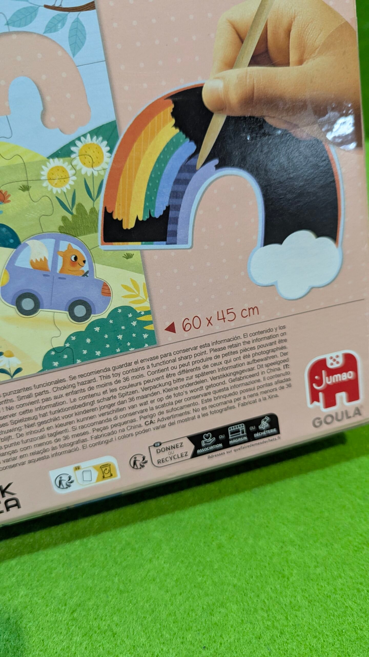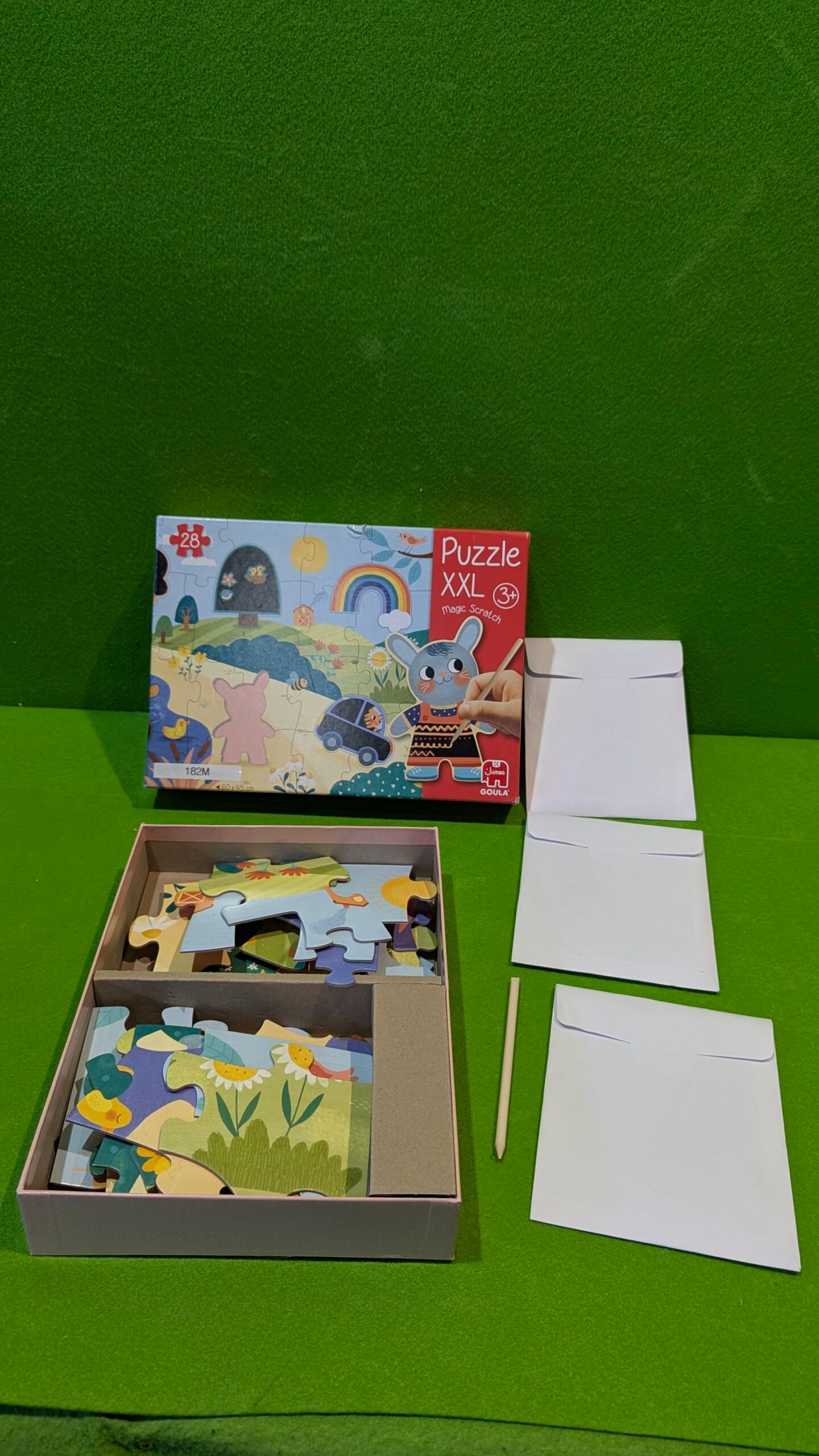 - Este óptimo rompecabezas para niños mayores de 3 años combina piezas grandes de cartón y elementos para rascar, fomentando el desarrollo mientras entretiene; con 28 piezas XXL fáciles de ensamblar, promueve la habilidad para resolver rompecabezas en los más pequeños; destaca por sus 6 piezas especiales con tinta para rascar, incluyendo un lápiz de madera, que revelan colores y diseños ocultos, añadiendo interactividad y un toque de creatividad a la experiencia