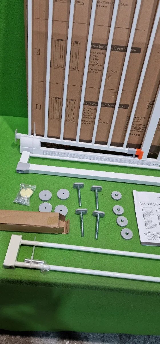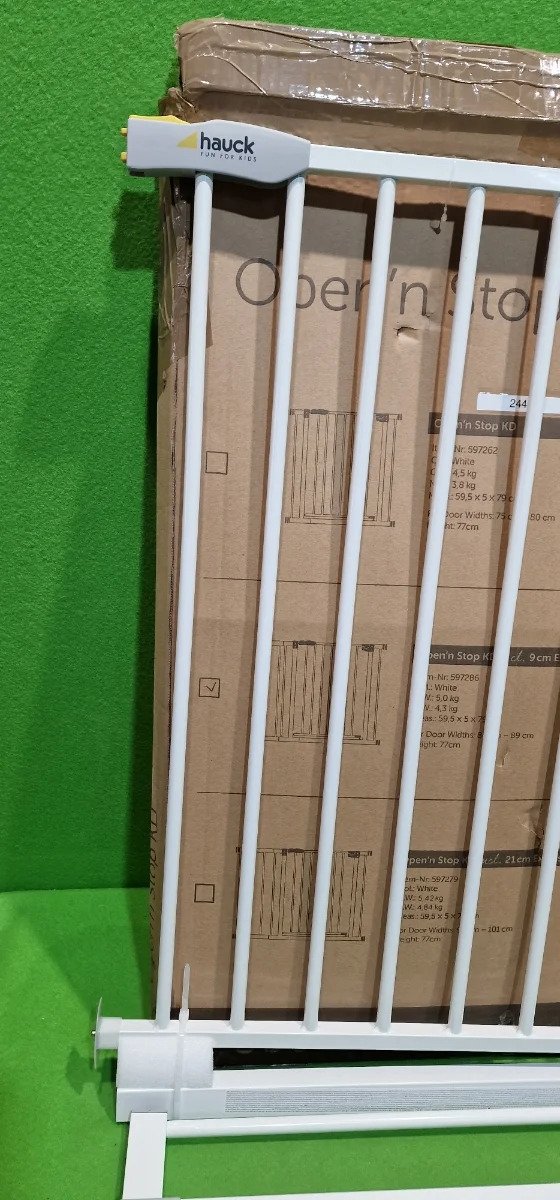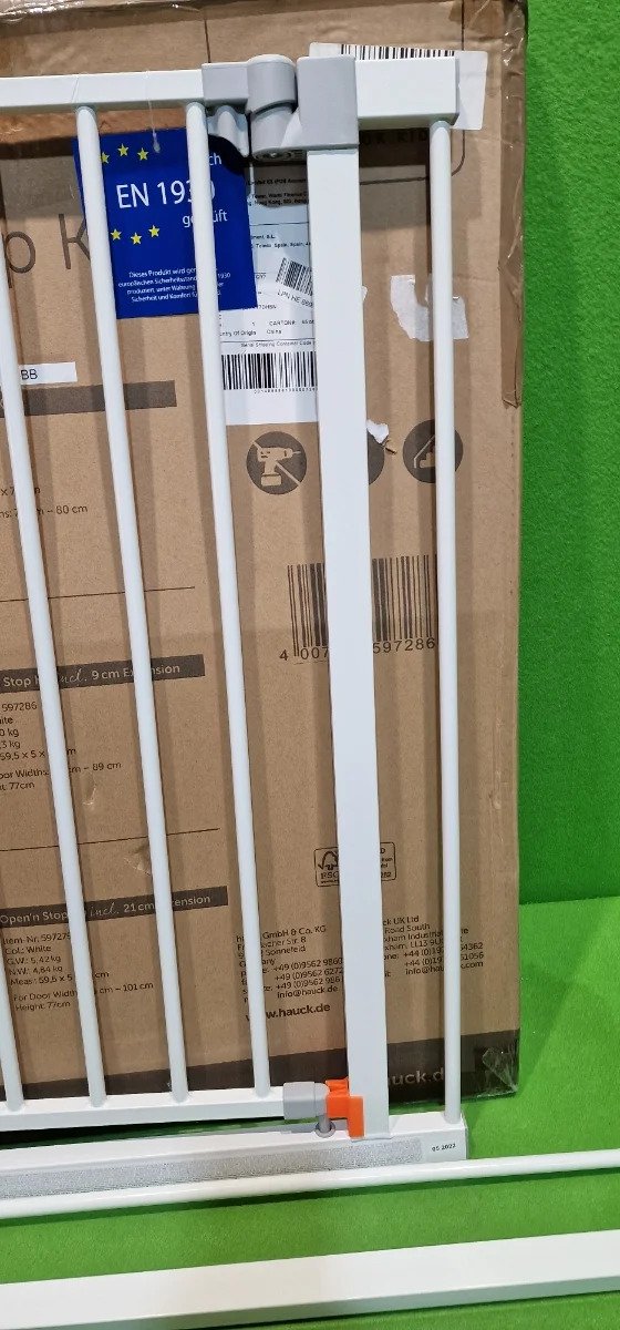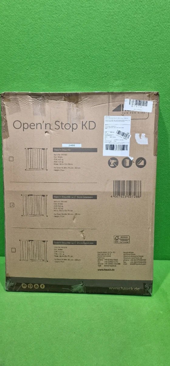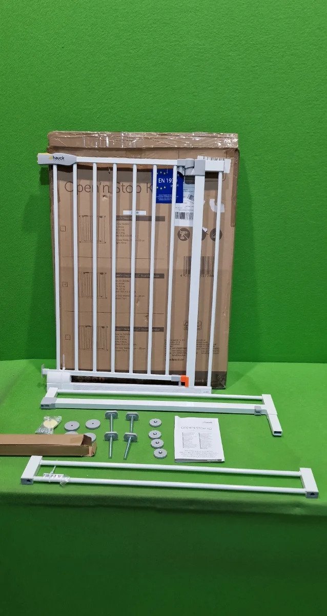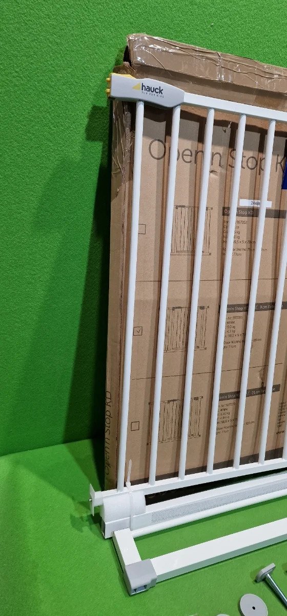 Hauck Puerta de seguridad para escalera/puerta Open N Stop KD con extensión de 9 cm, para anchuras de 84 a 89 cm, sin taladrar, se abre con una mano, gira por ambos lados, metálica, blanca