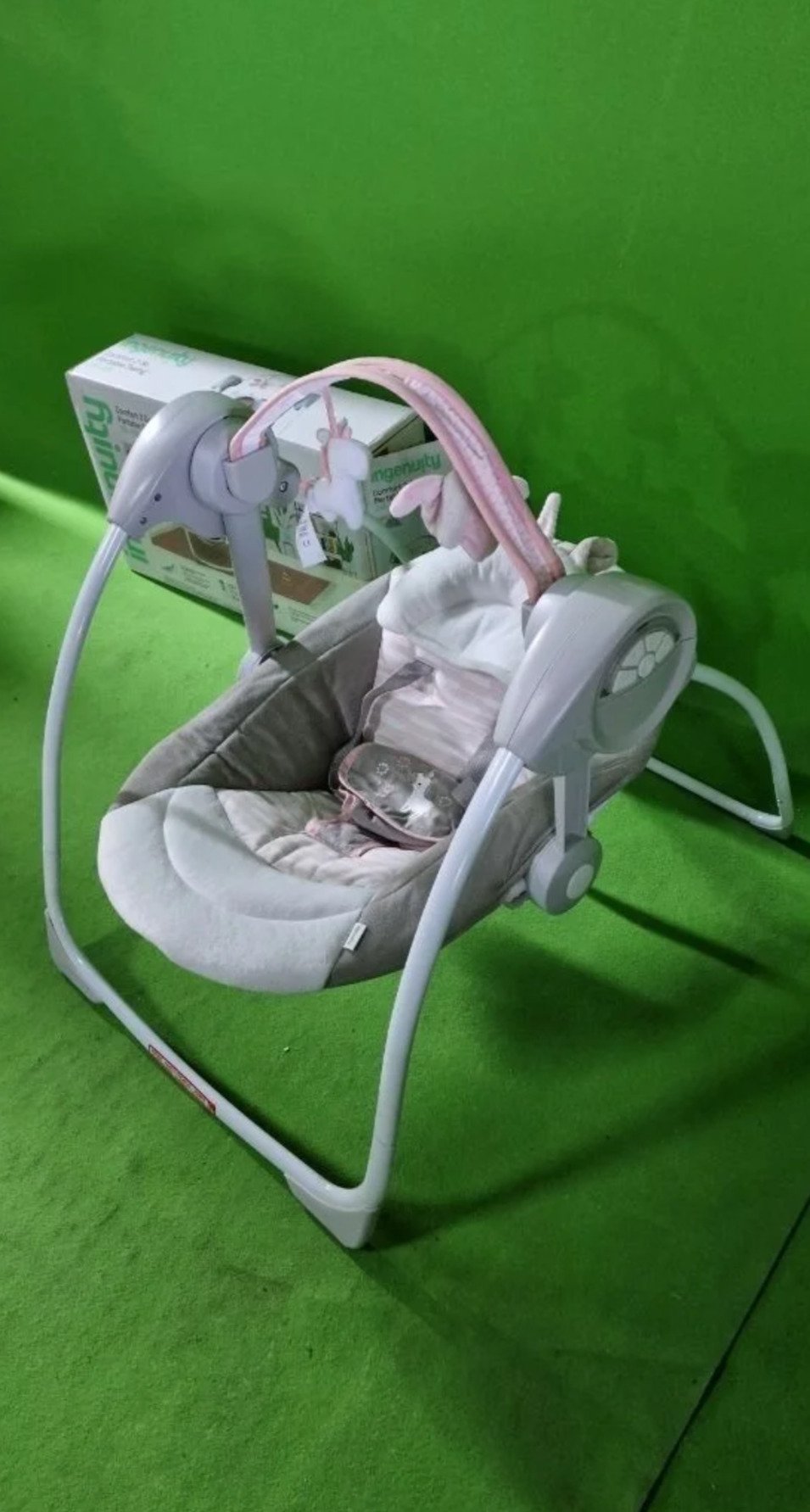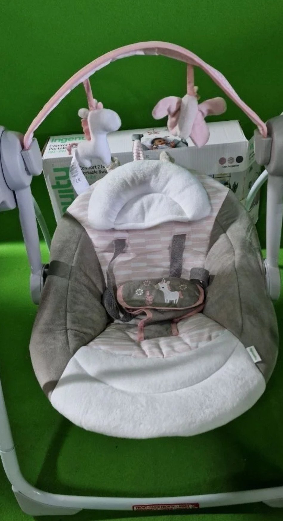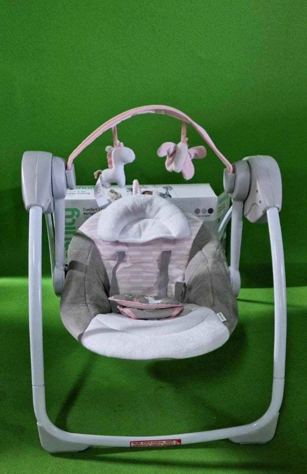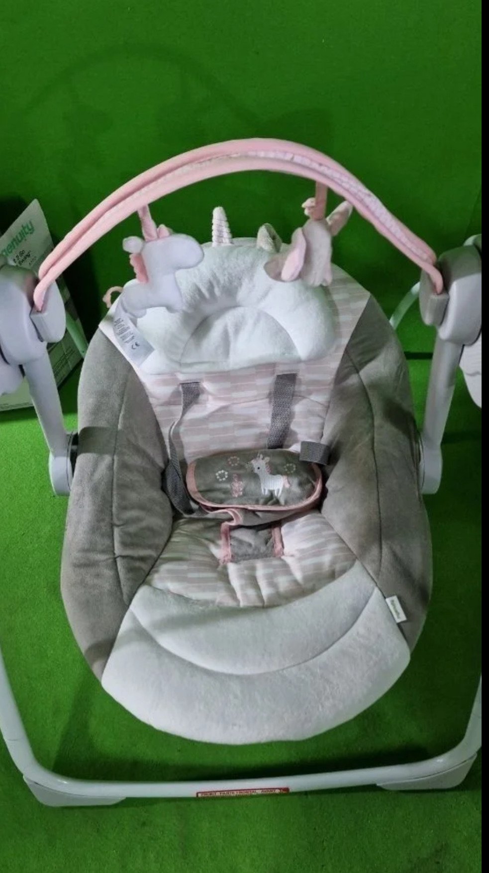 Ingenuity, Columpio Compacto y Plegable Flora el Unicornio, 6 velocidades de balanceo, temporizador, 12 melodías, arco de juegos extraíble, rosa, desde recién nacido hasta los 9 kg