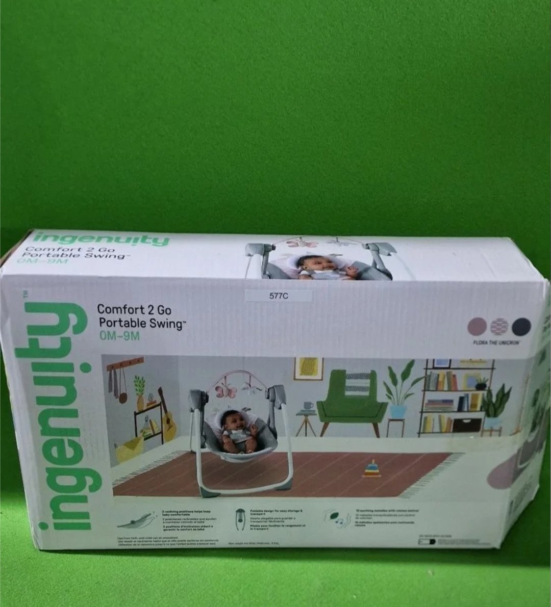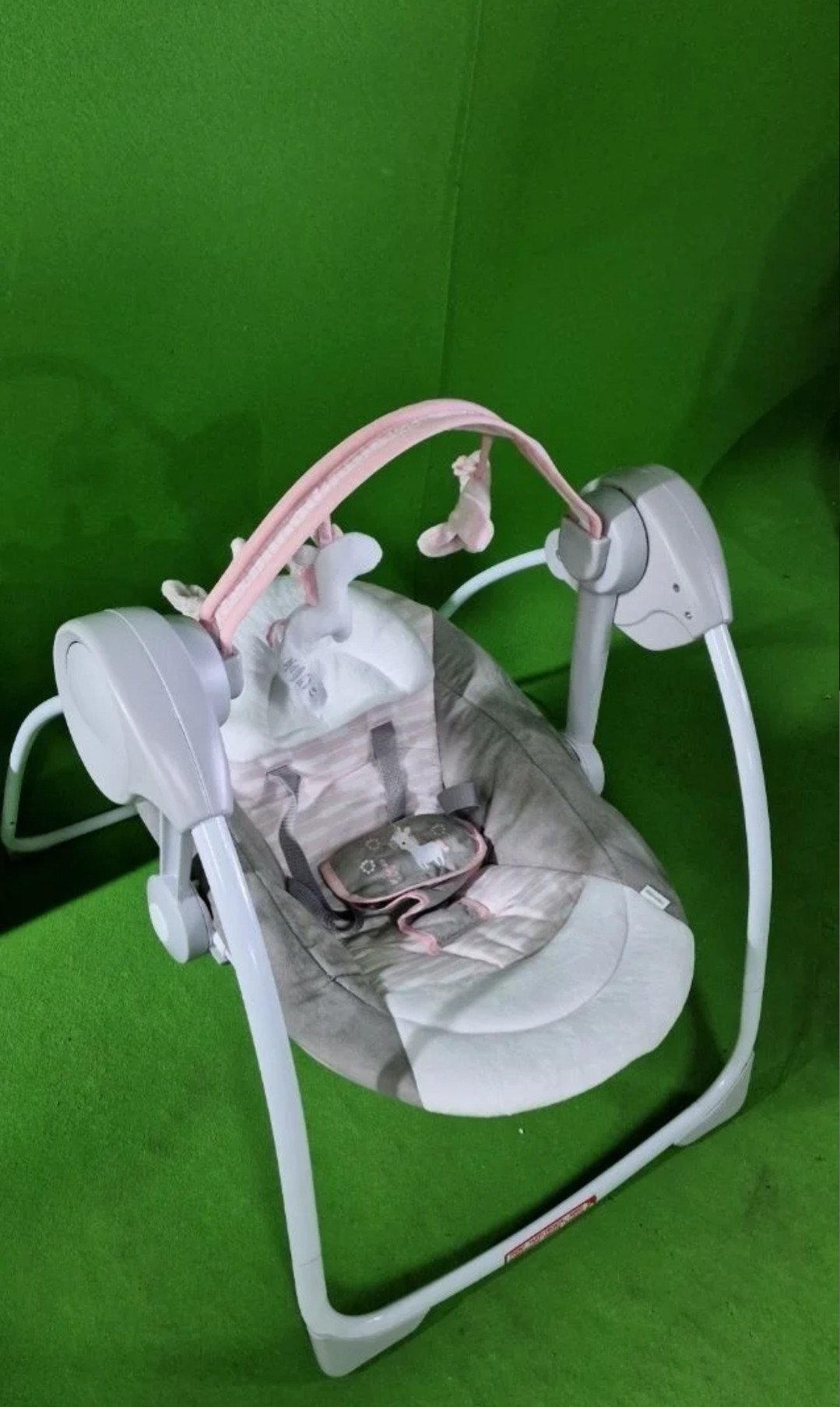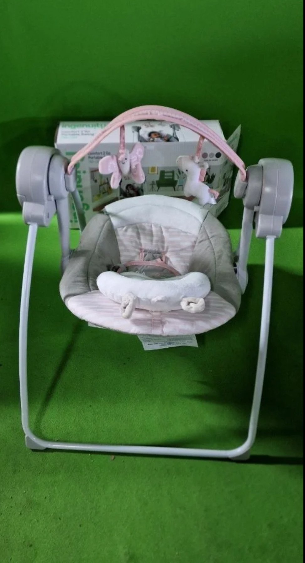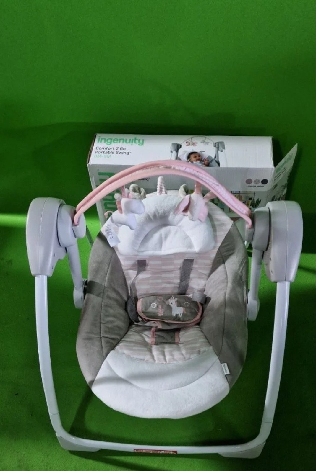 Ingenuity, Columpio Compacto y Plegable Flora el Unicornio, 6 velocidades de balanceo, temporizador, 12 melodías, arco de juegos extraíble, rosa, desde recién nacido hasta los 9 kg