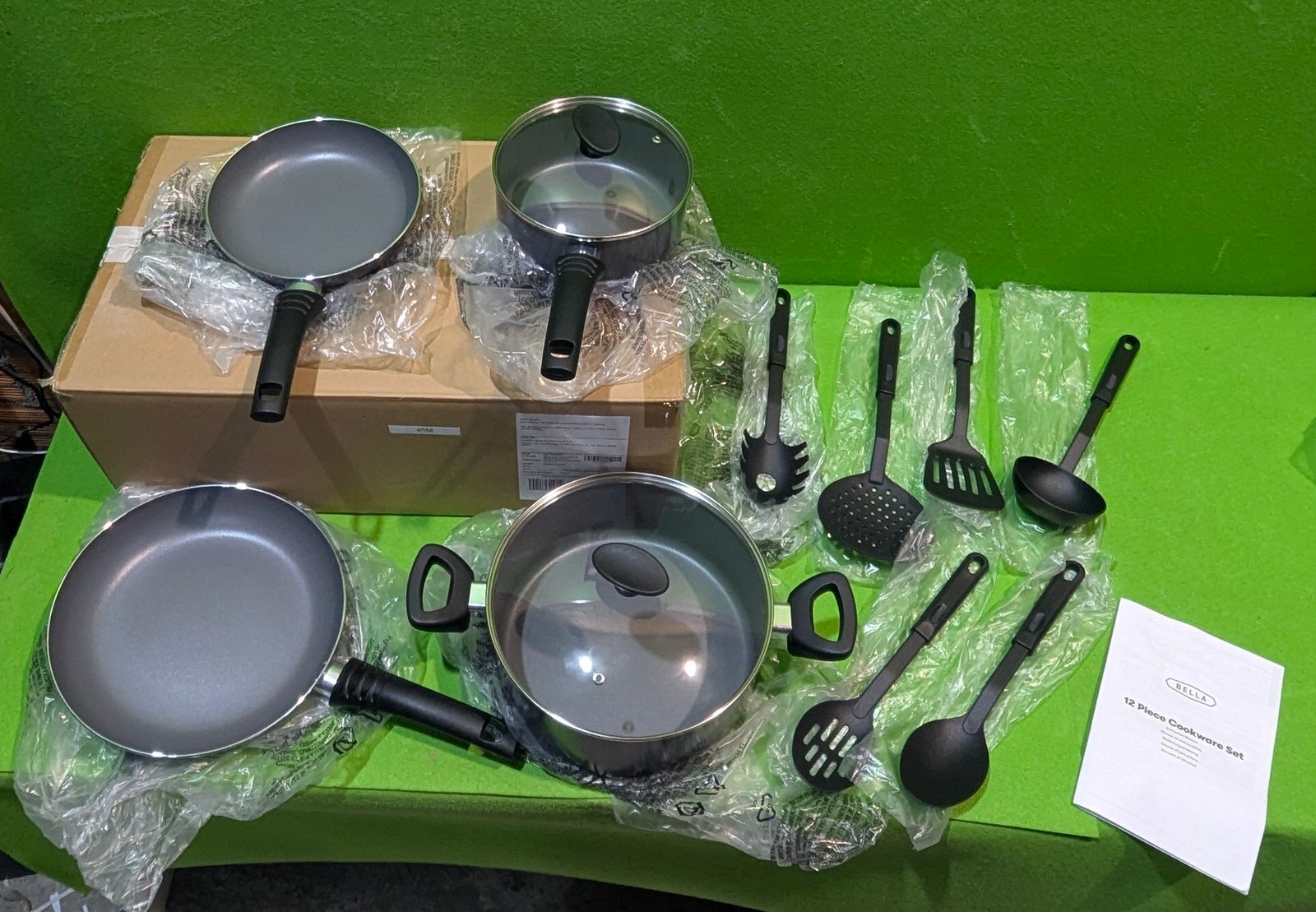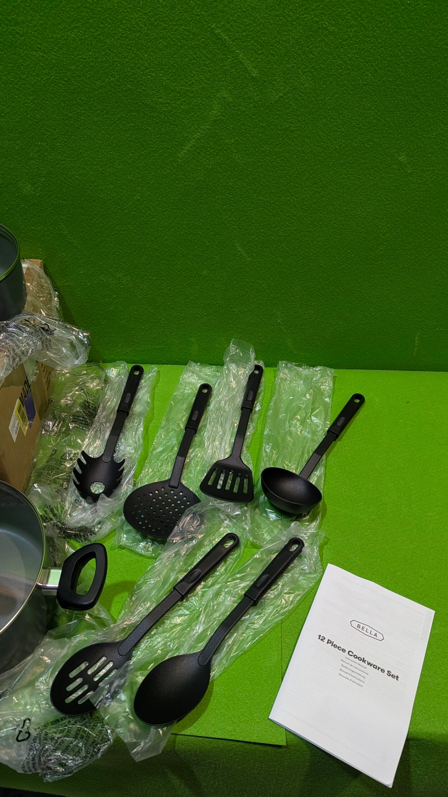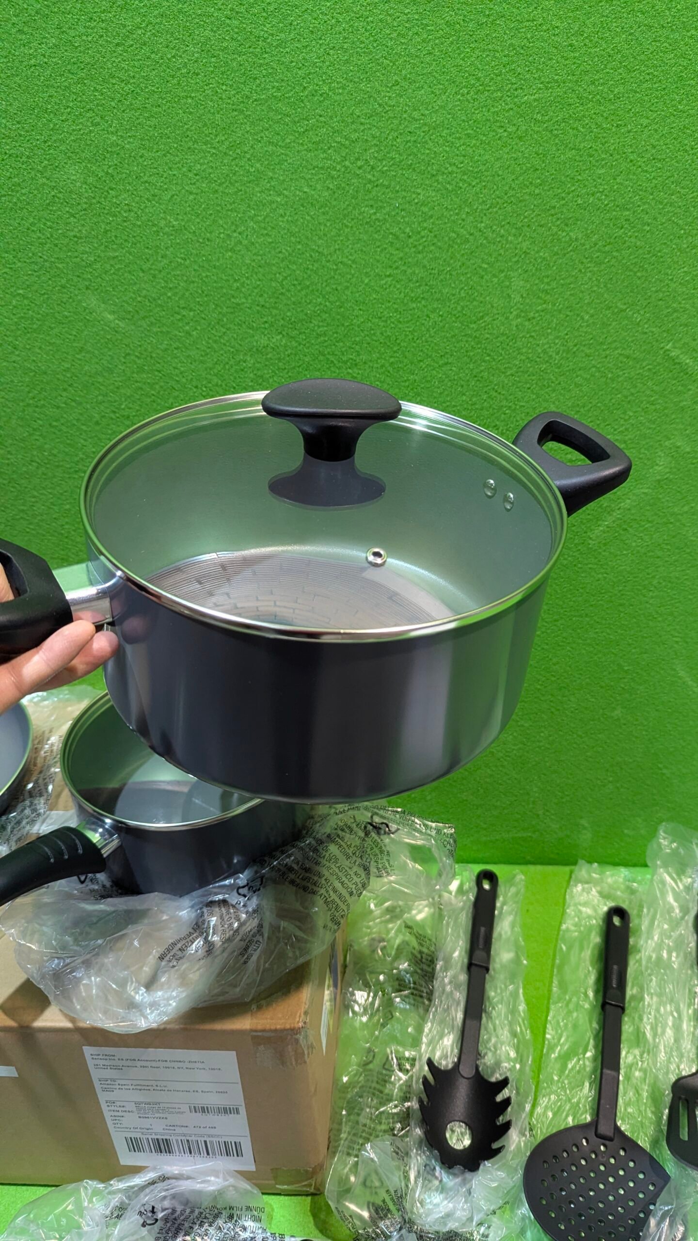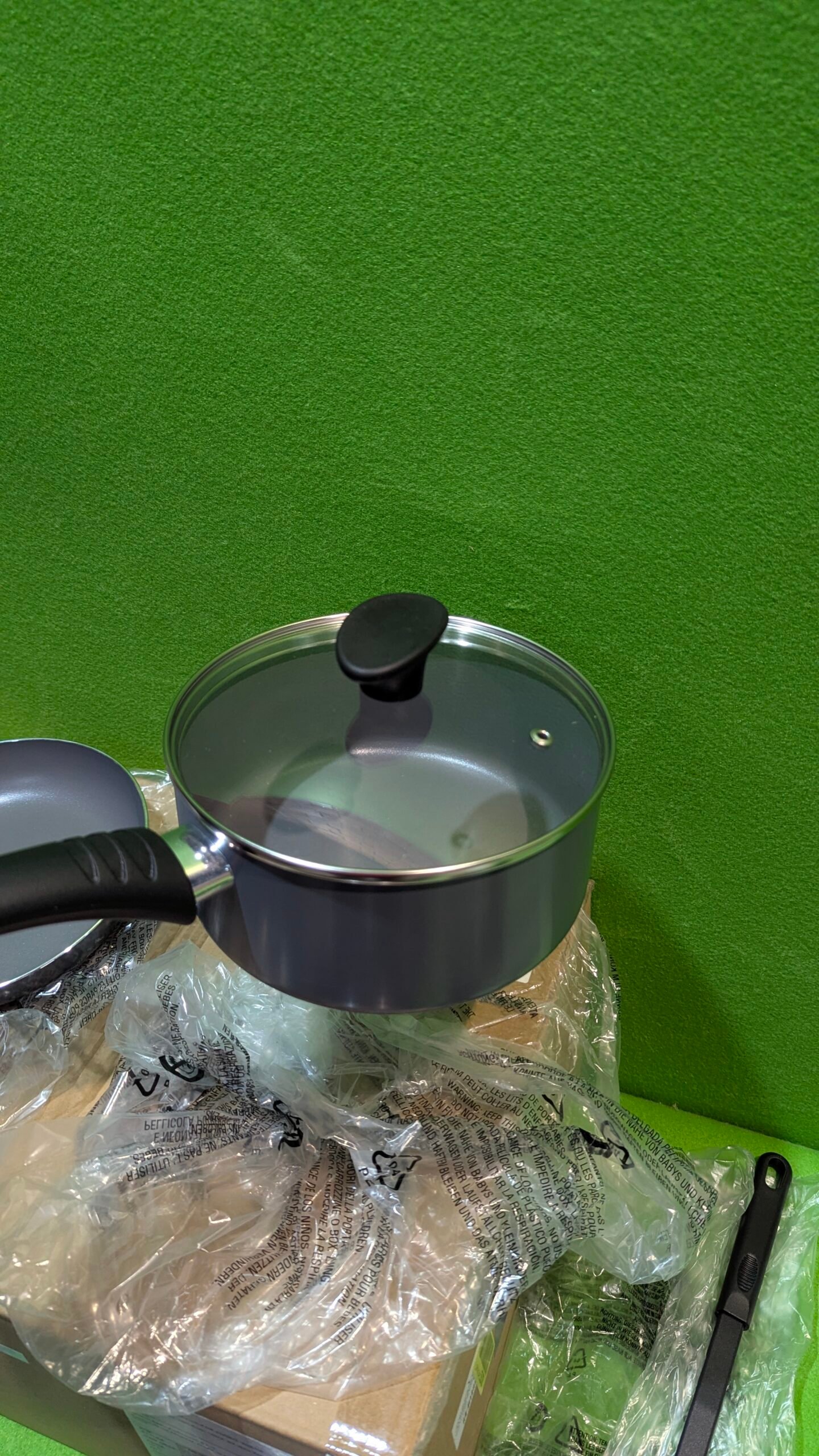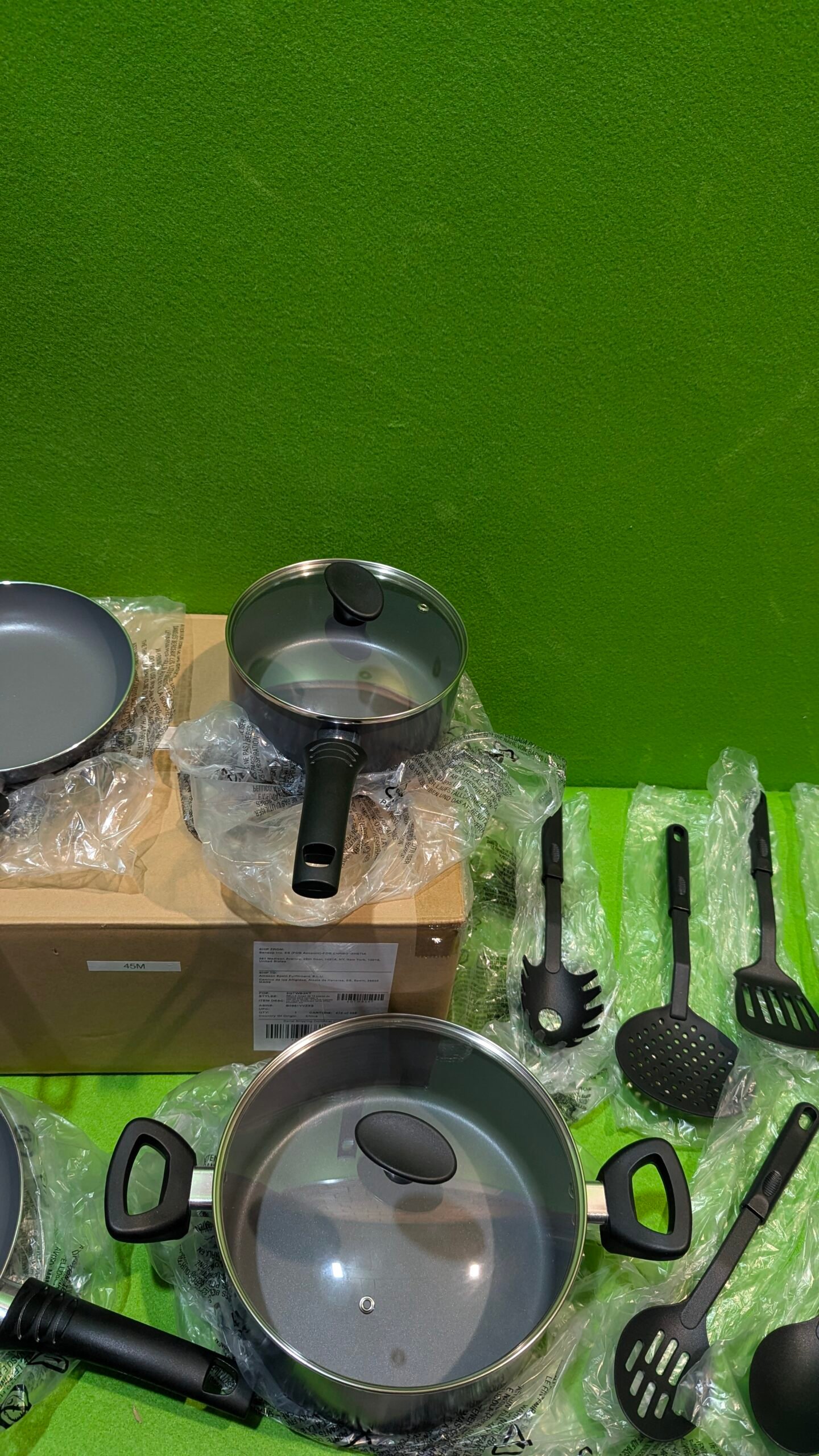 Juego de 12 piezas de utensilios de cocina, juego completo de ollas y sartenes de cocina, con revestimiento antiadherente, mangos resistentes al calor, tapas de vidrio templado, sartén, olla para sopa, olla para leche, variedad de ollas y espátulas