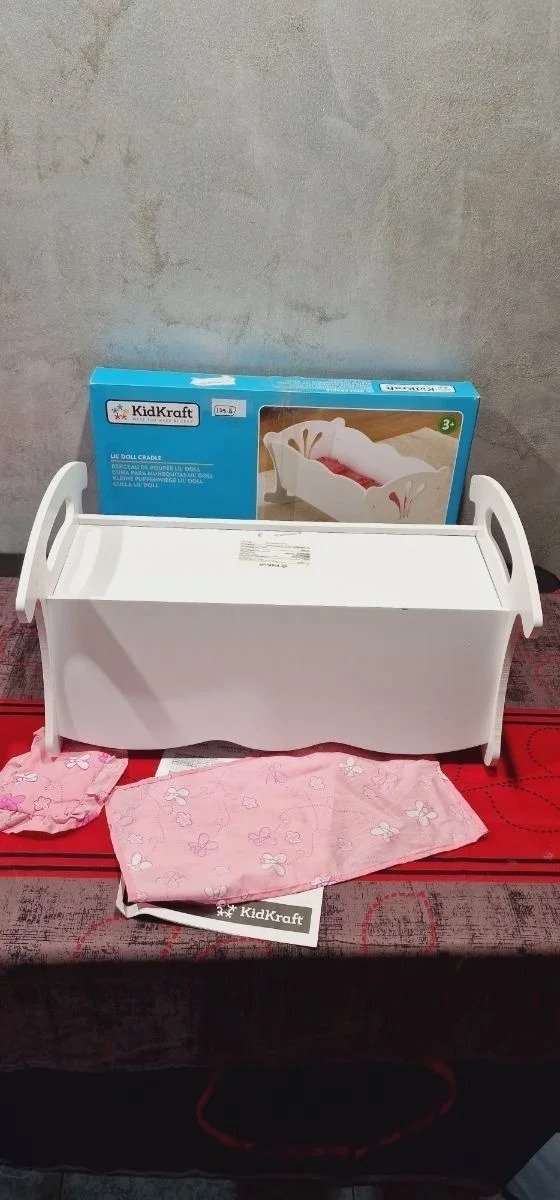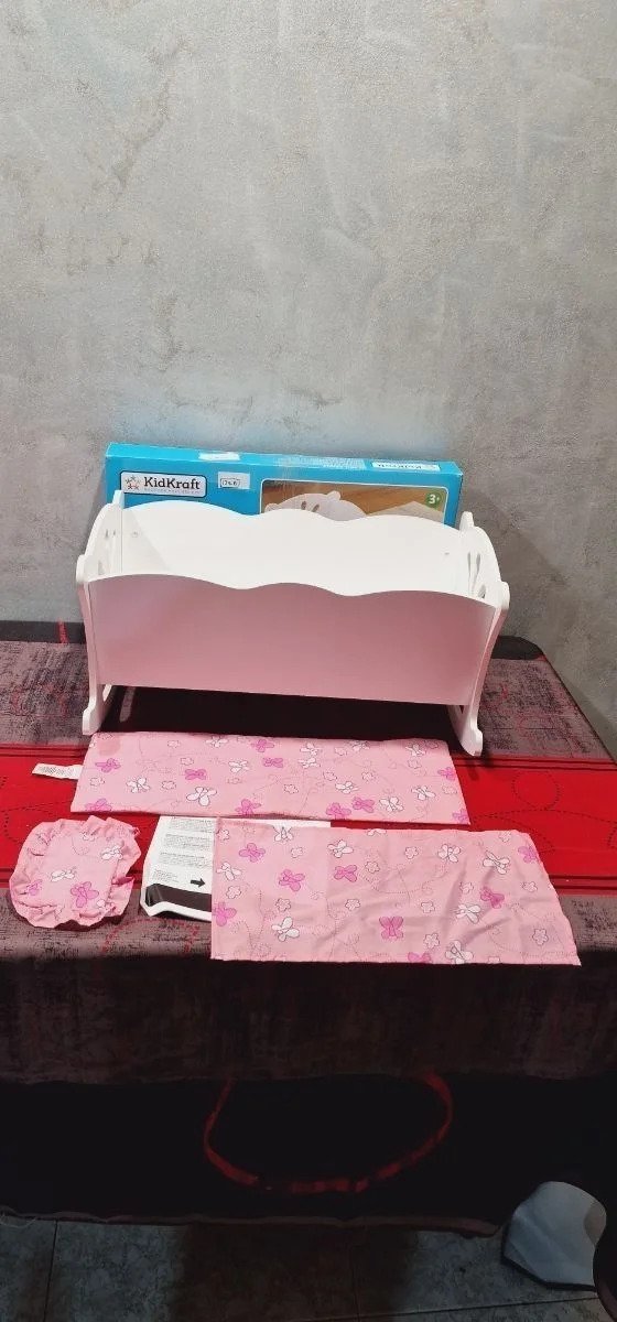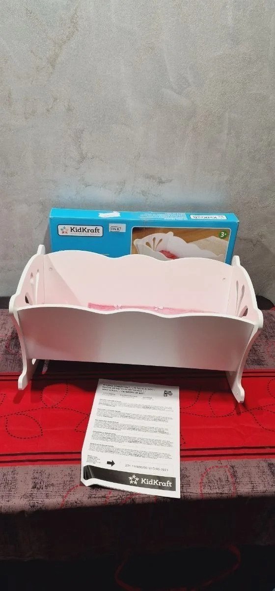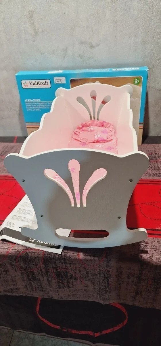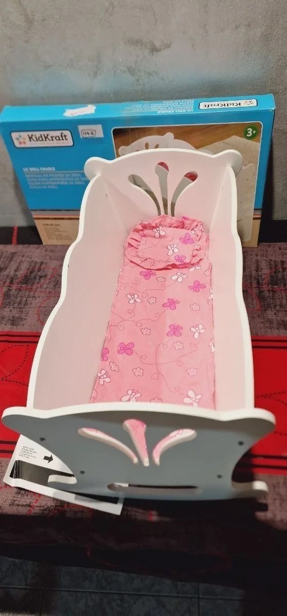 KidKraft- Cuna de madera de juguete con ropa de cama rosa, para muñecos Lil’ Doll Craddle , Color Blanco (60101) Ideal para muñecas grandes de hasta 45 cm de altura Está hecha de madera y tiene unos bonitos recortes detallados en los lados