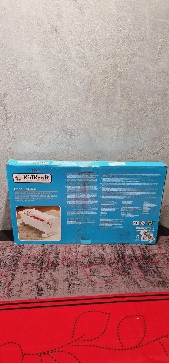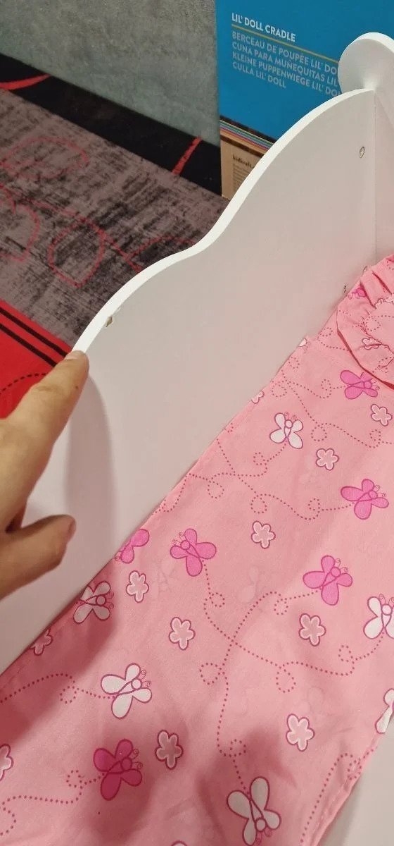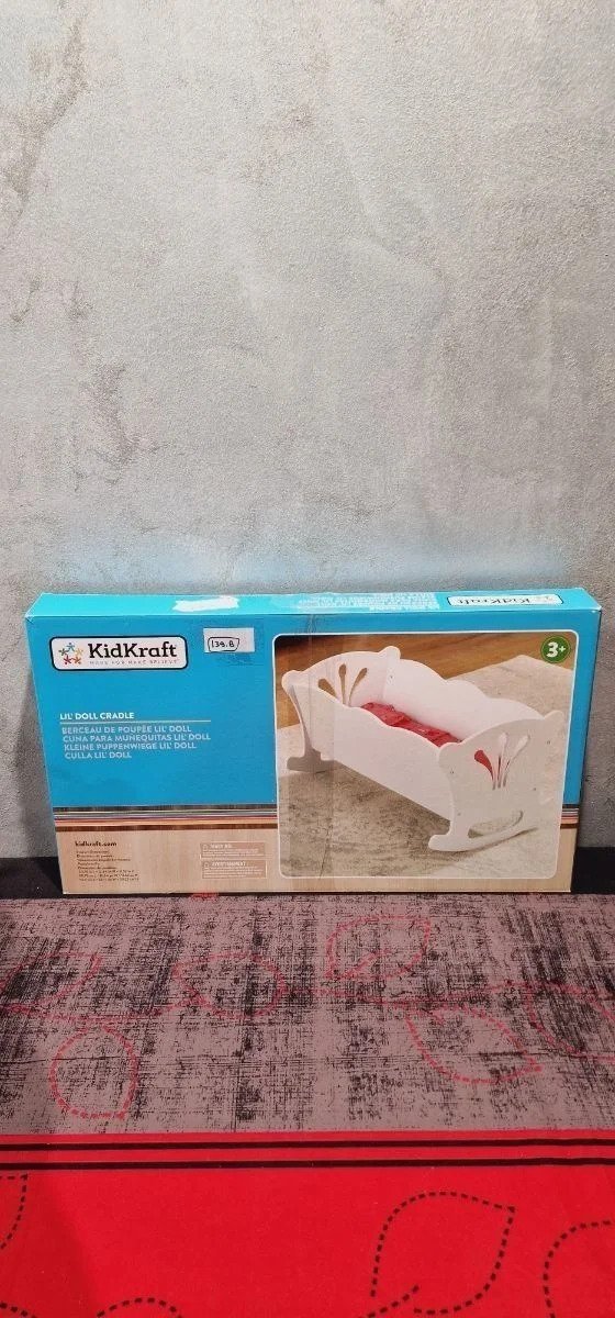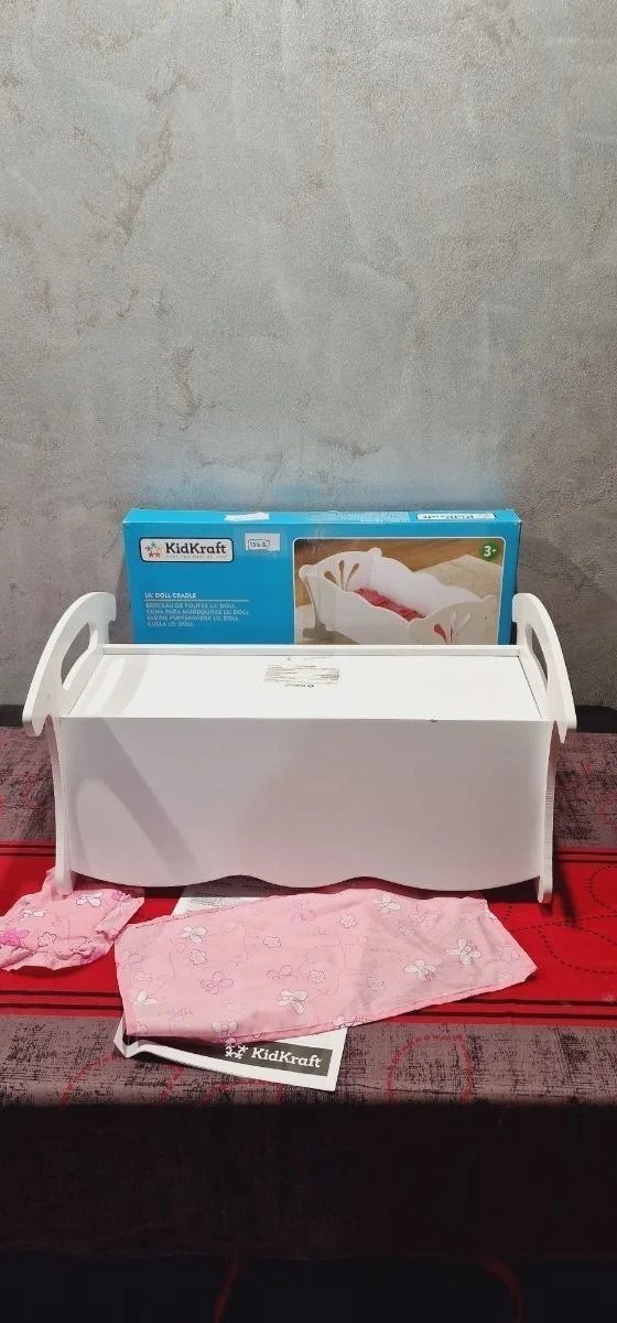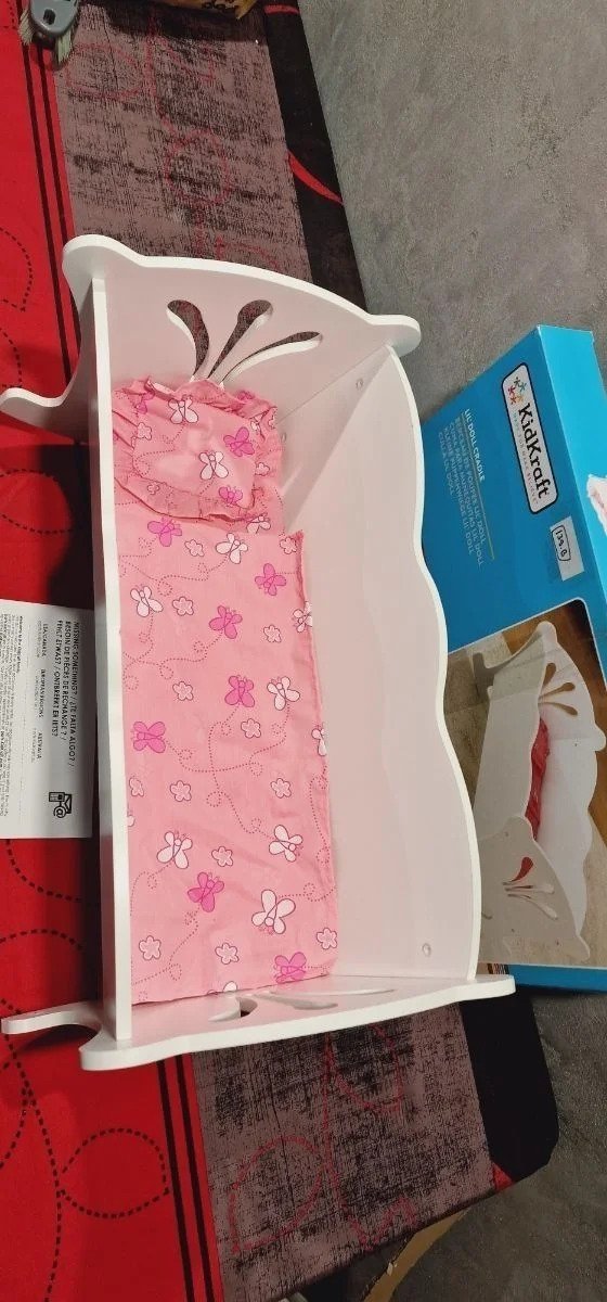 KidKraft- Cuna de madera de juguete con ropa de cama rosa, para muñecos Lil’ Doll Craddle , Color Blanco (60101) Ideal para muñecas grandes de hasta 45 cm de altura Está hecha de madera y tiene unos bonitos recortes detallados en los lados
