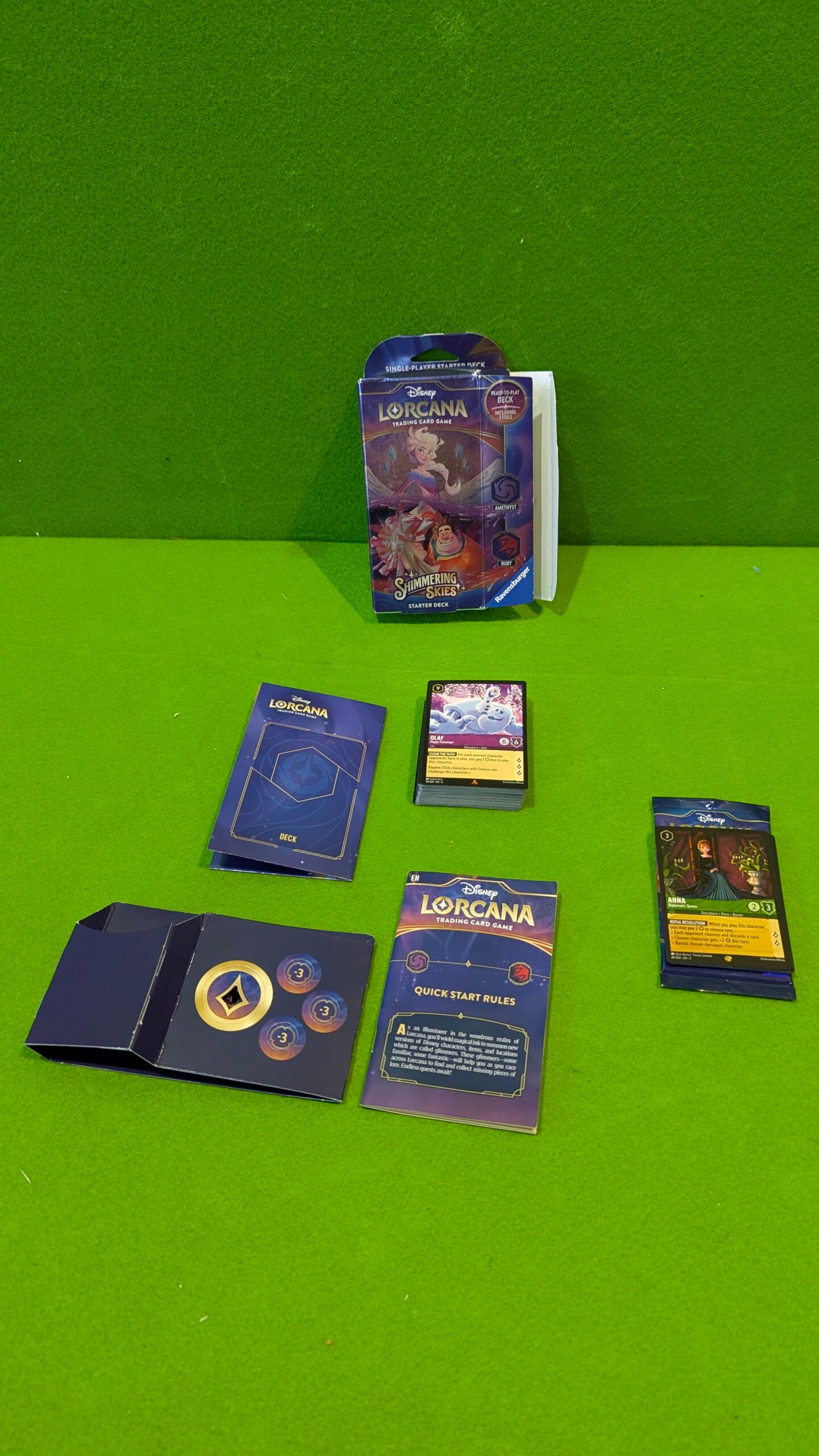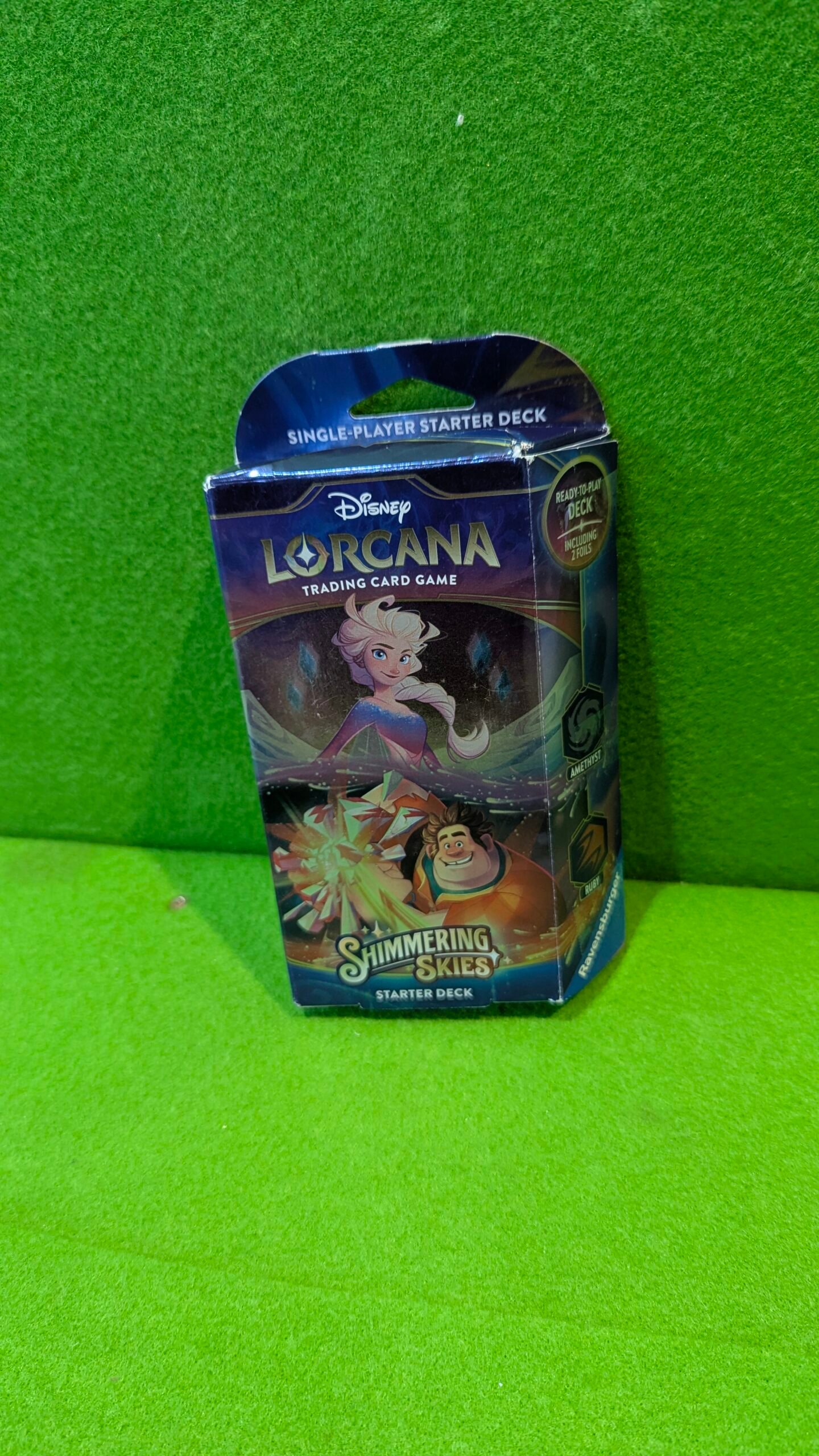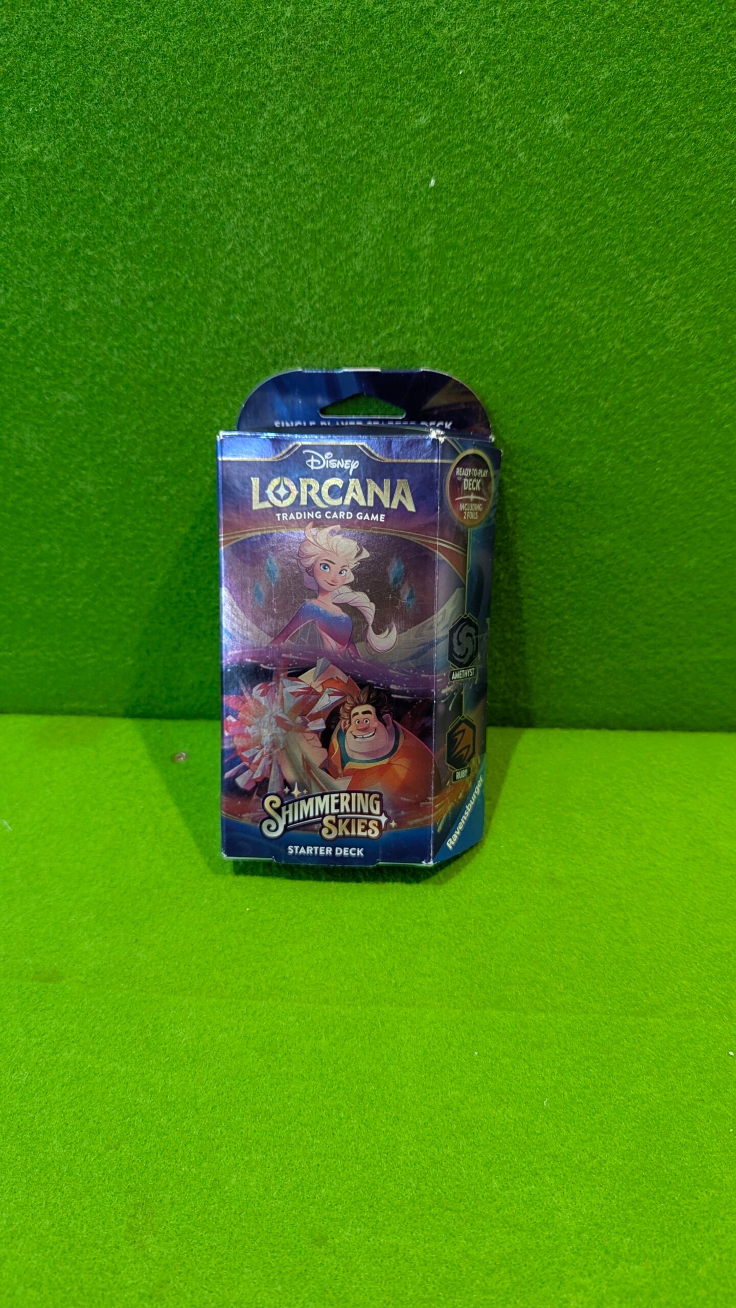 - Contenido del paquete: Lorcana Starter Deck Chapter 5: Shimmering Skies: amatista y rubí – inglés + Heartforcards Protección de envío con 1 baraja con 60 tarjetas, incluidas 2 tarjetas de papel de aluminio con los personajes que se pueden ver en la parte delantera del paquete, 11 marcador de daños, 1 instrucciones de juego, 1 paquete de refuerzo con 12 cartas aleatorias. Idioma: Inglés