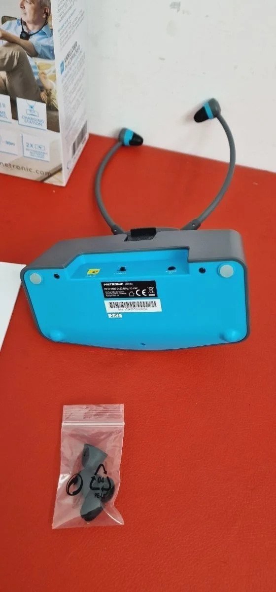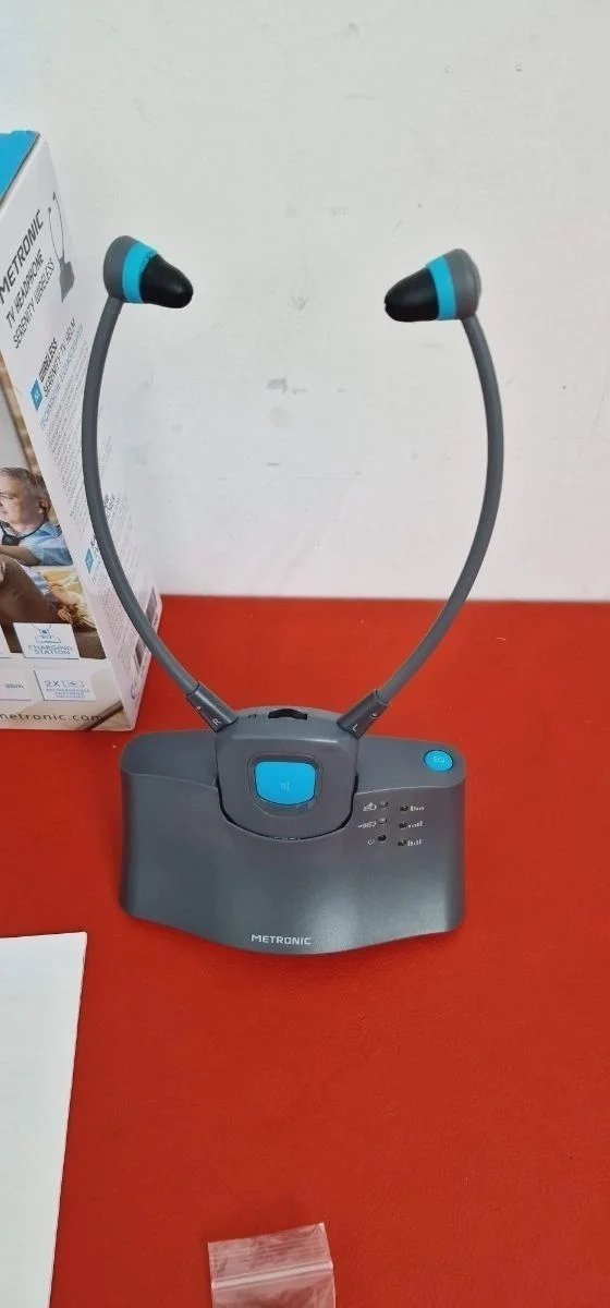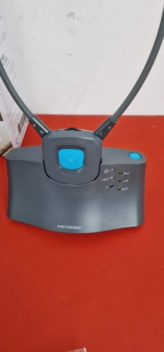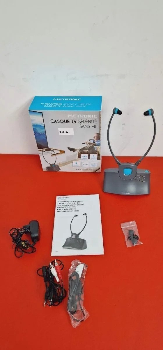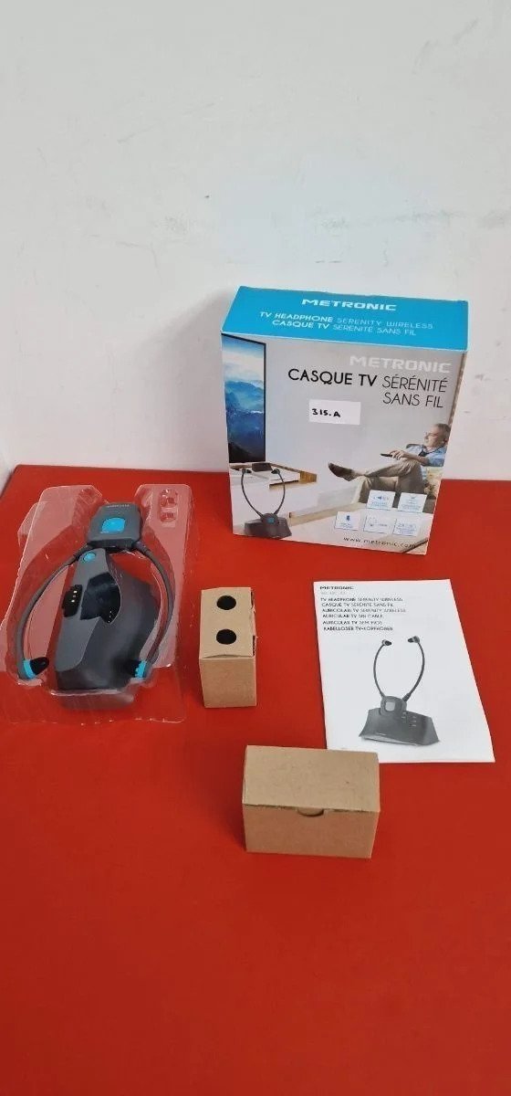 Metronic 480183 – Auriculares sin cable para TV «SERENITÉ», con micro y base de carga Fácil de instalar: Los auriculares inalámbricos TV METRONIC sólo necesitan unos minutos para realizar la conexión con el TV mediante el cable jack conectado a la toma auricular del TV.