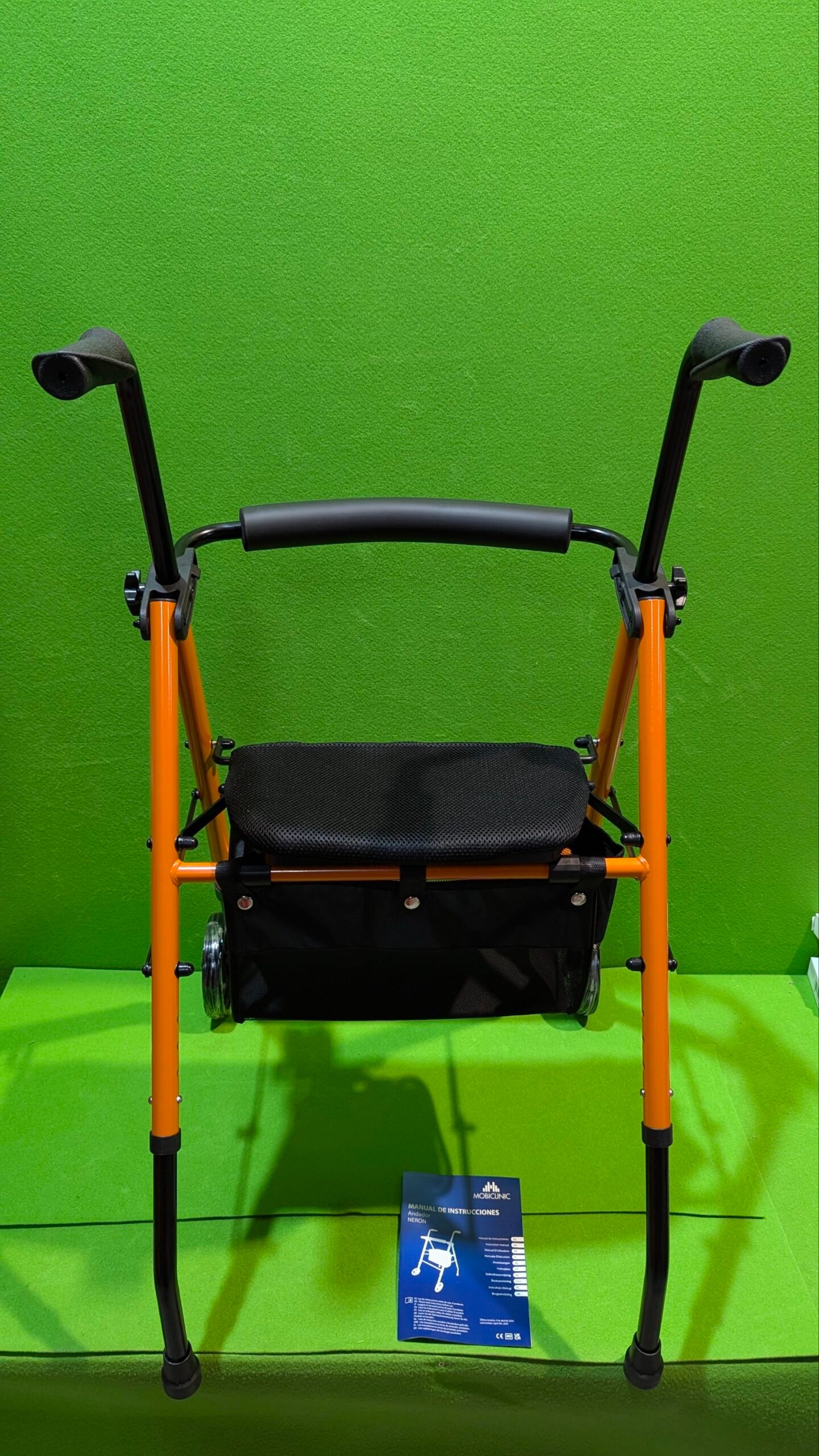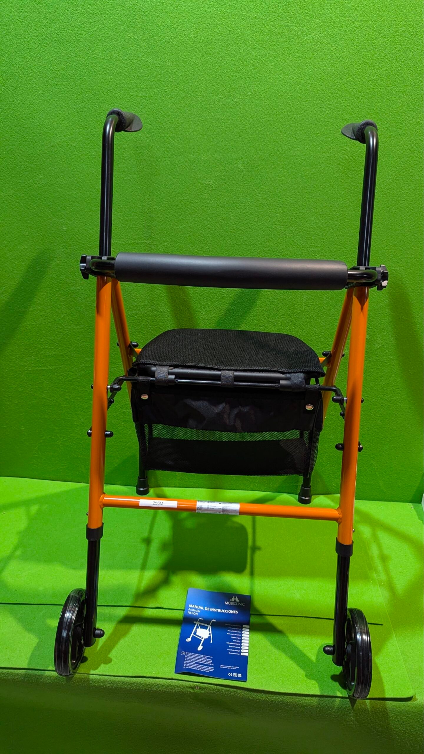 Mobiclinic, Andador Plegable, Ligero, Nerón, con Asiento y Respaldo, 2 ruedas, Conteras Antideslizantes, Máx. 100 Kg, Cesta, Acero, Naranja