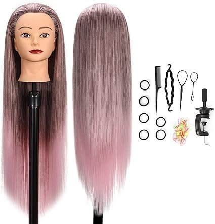 Peluquería Cabeza de Entrenamiento Peluquería, Cabeza de Maniquí, 26-28 Pulgadas Cabeza de Muñeca de Cosmetología de Fibra Sintética 100%(Rosa Degradado)