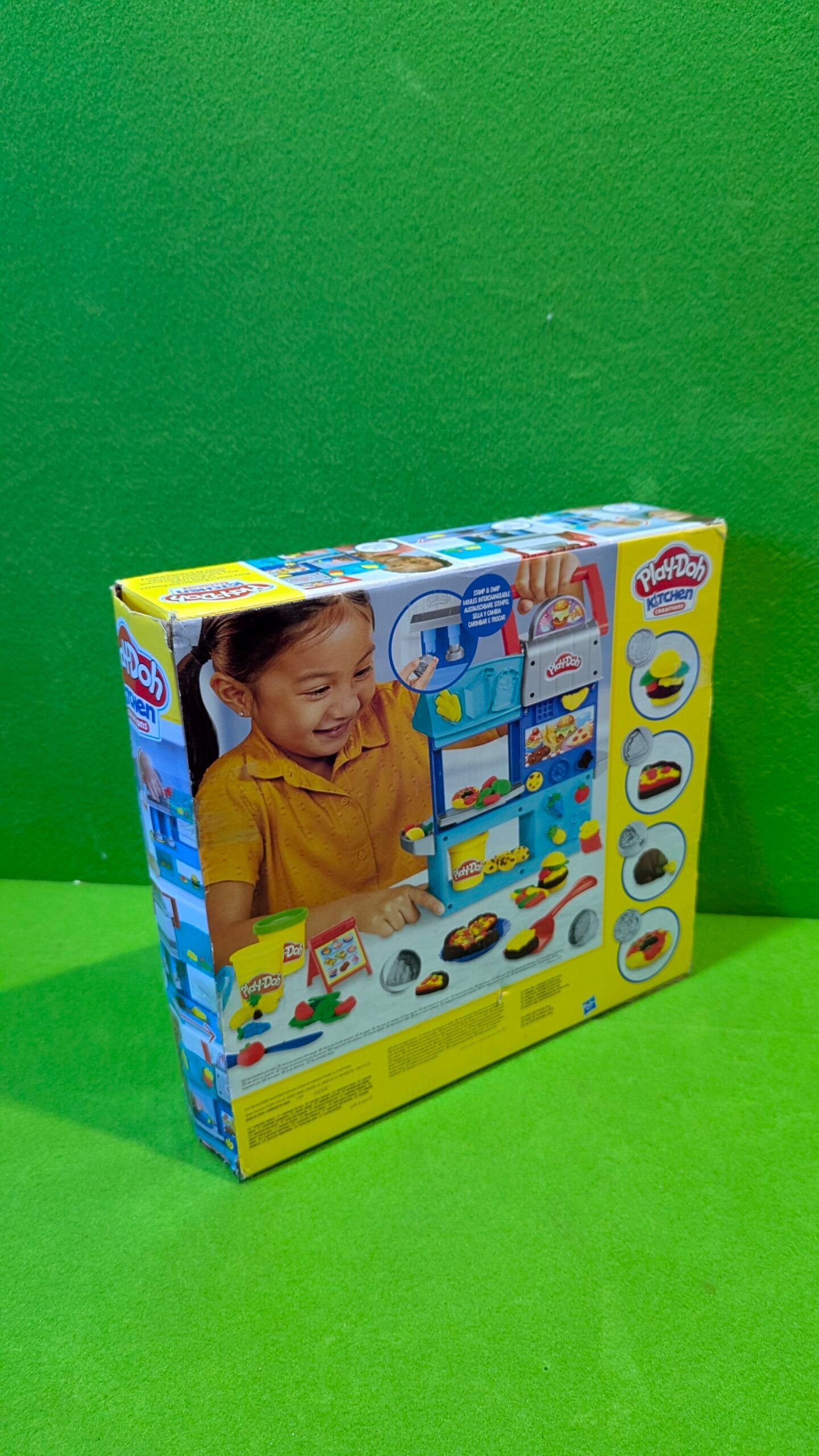 - DECORA Y COMPARTE: Usa los medios moldes en ambos lados del set de juego para crear platos principales y acompañamientos de juguete, ¡luego pon tus creaciones en los platos y pásalos por la ventanilla para compartir con tus amigos!