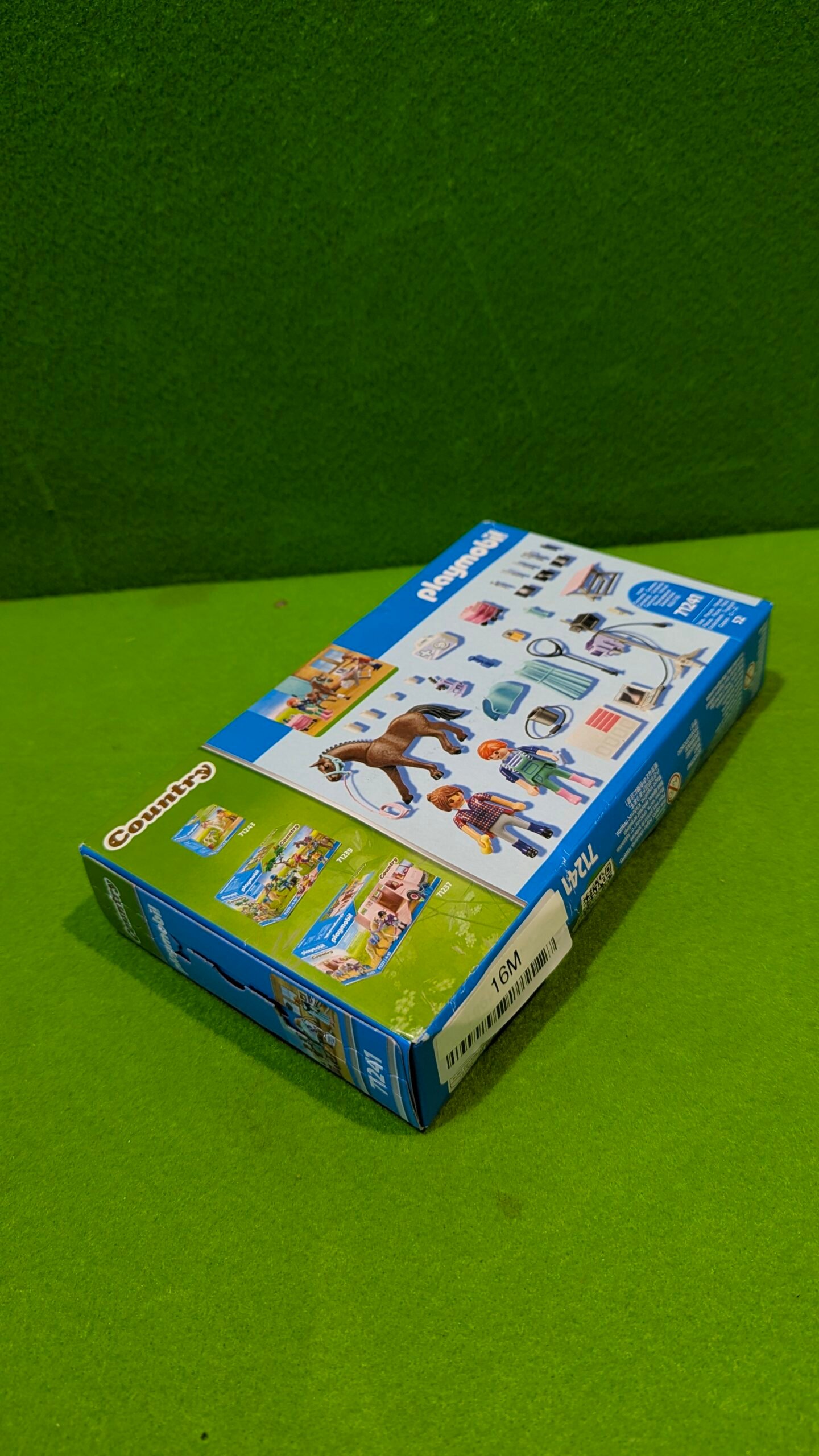 - Contenido: Figuras: veterinario, mujer; animales: caballo; accesorios: 1 máquina de rayos X móvil, 1 mesa de almacenamiento, 1 ordenador, 1 microscopio, 3 radiografías, 1 estetoscopio, 1 maletín veterinario, 1 cubo, 1 juego de instrumentos de operación, 1 recortadora, 1 crema, 1 bote de spray, 2 botellas, 1 bote con tapa de rosca, 1 botella de spray, 4 vendas, 1 delantal quirúrgico, 1 sábana de vendaje, 1 cabezada, 1 riendas, 1 manta para el caballo