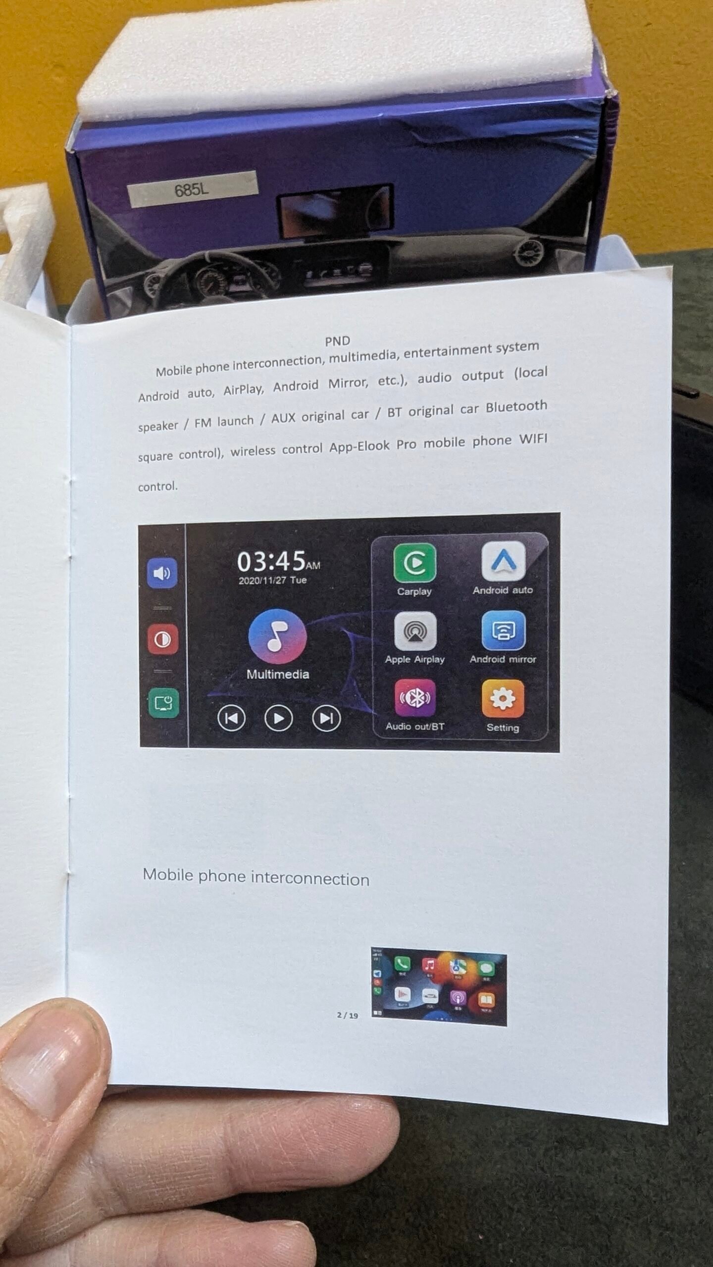 Interconexión con teléfonos móviles, multimedia, sistema de entretenimiento (Android Auto, AirPlay, Android Mirror, etc.), salida de audio (altavoz local / FM / AUX original del coche / Bluetooth original del coche, control cuadrado), control inalámbrico mediante la aplicación Elook Pro para teléfono móvil.