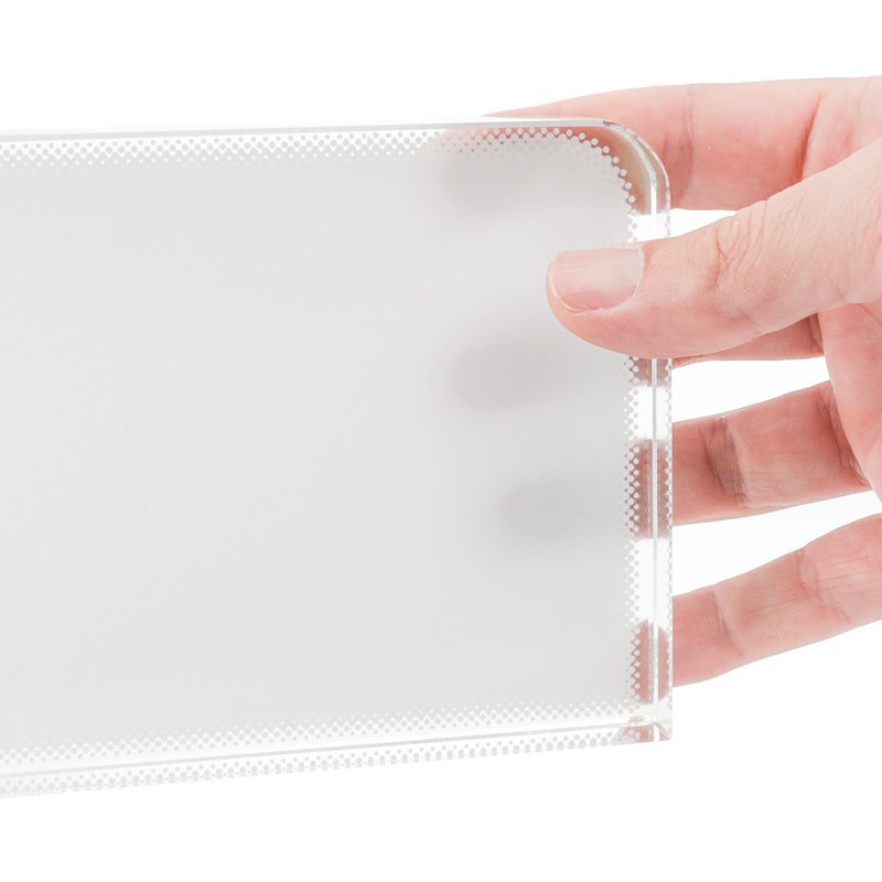 Fabricado en cristal macizo de 18 mm de grosor, este bloque destaca por su resistencia y estabilidad, pudiendo sostenerse por sí mismo sin necesidad de soportes adicionales.