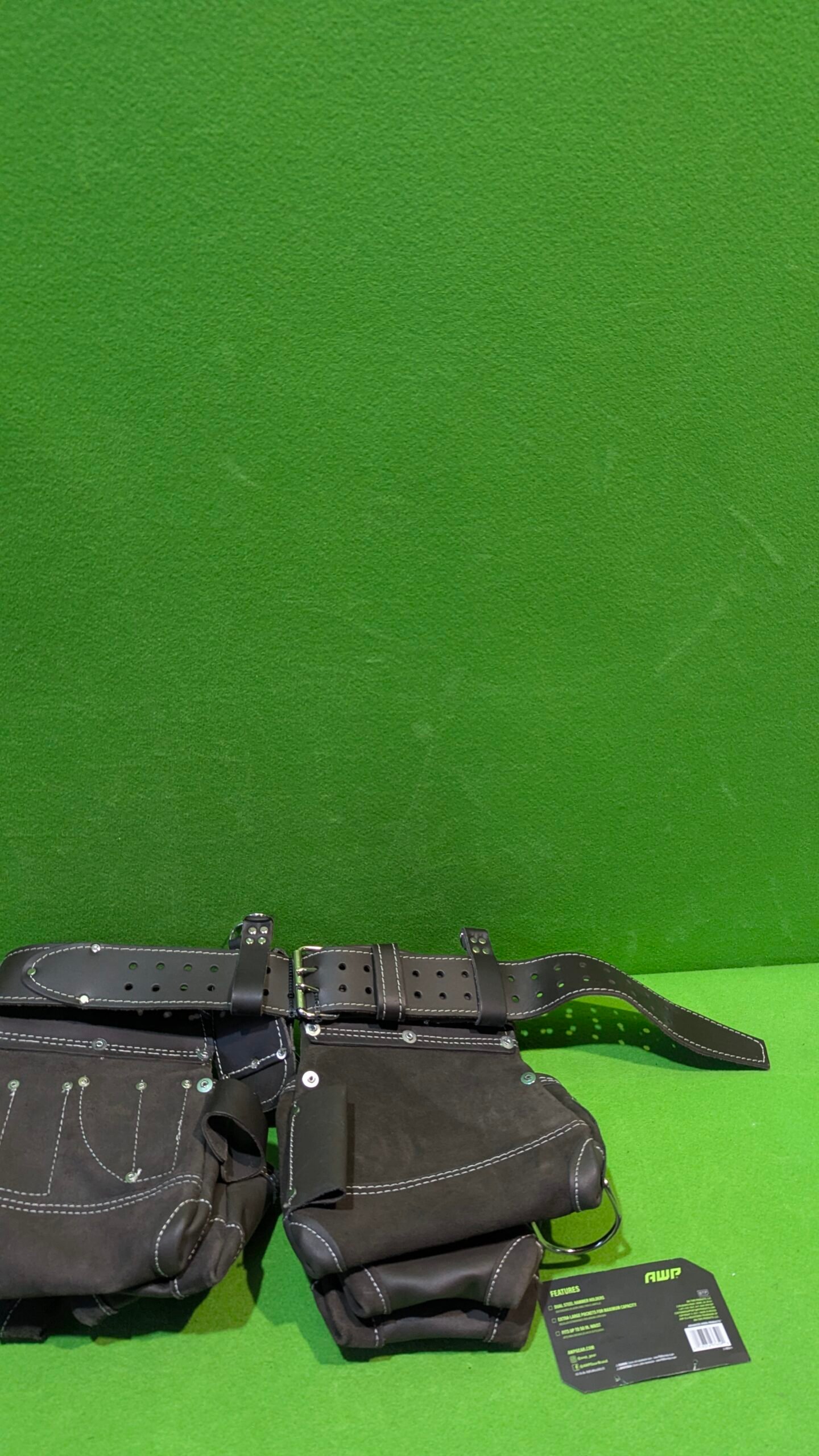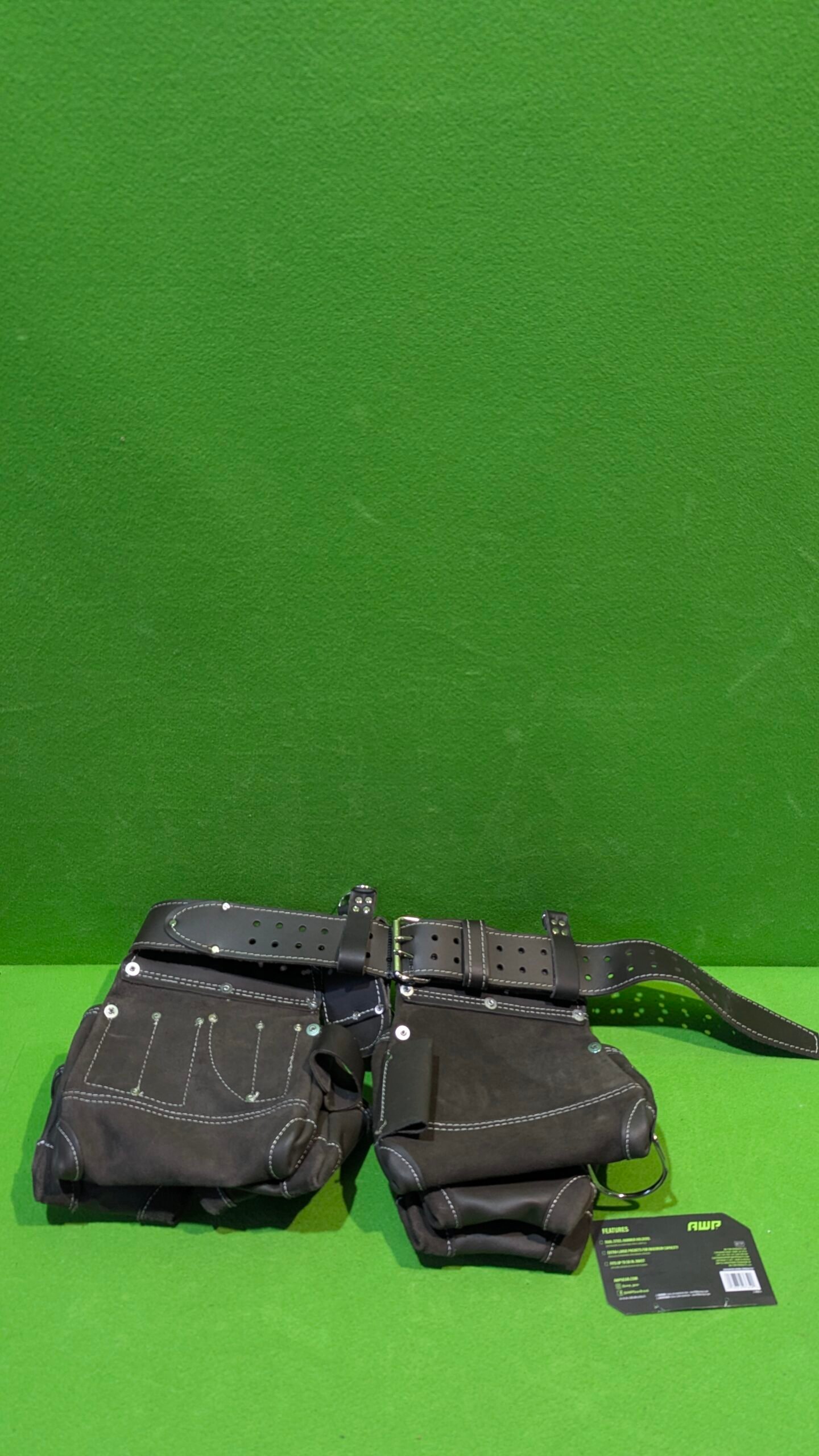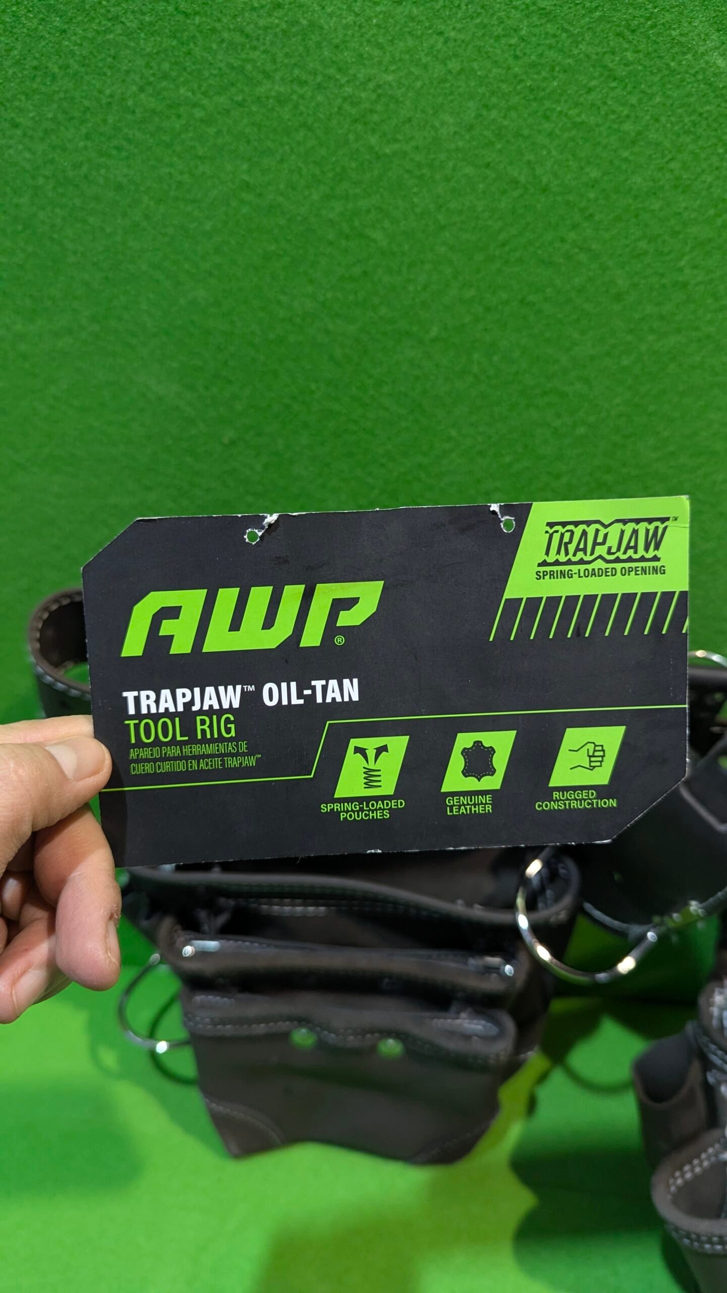 • El aparejo de herramientas de cuero curtido al aceite AWP cuenta con tecnología patentada TrapJaw en dos de los bolsillos. TrapJaw se abre para proporcionar un fácil acceso y cierre a presión para asegurar pequeñas herramientas y cierres en el interior