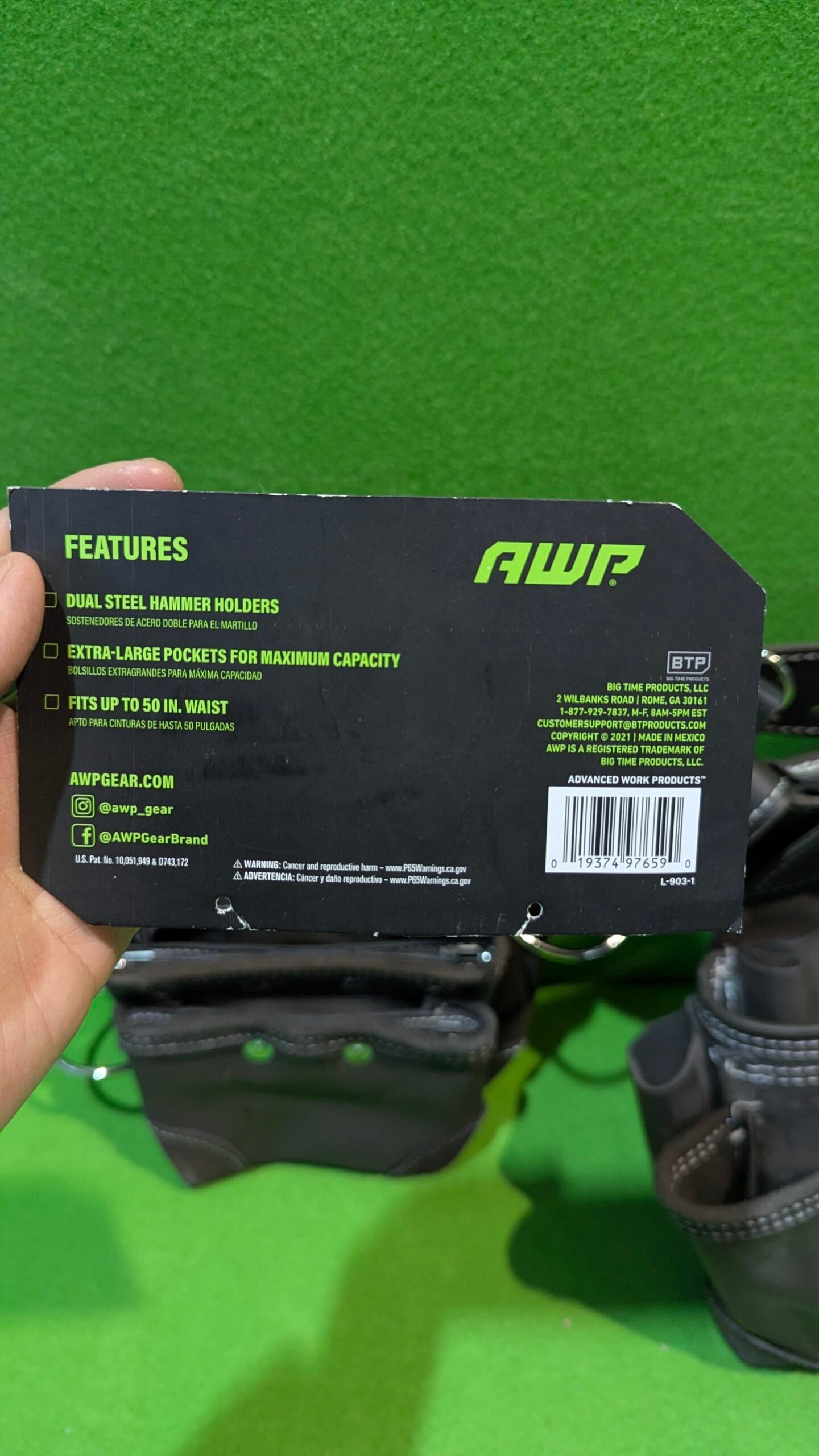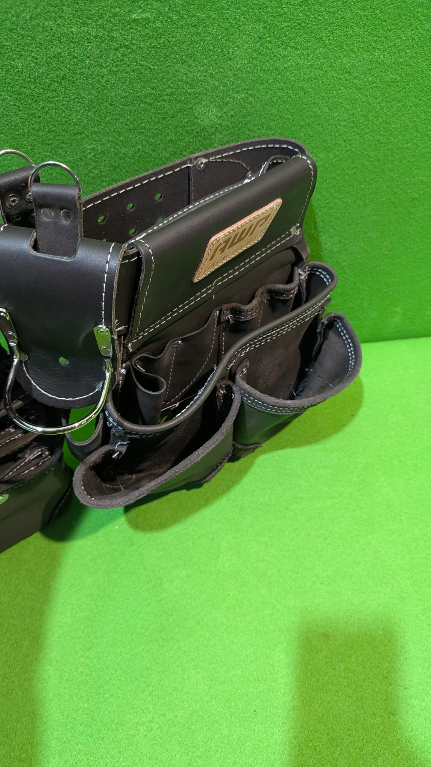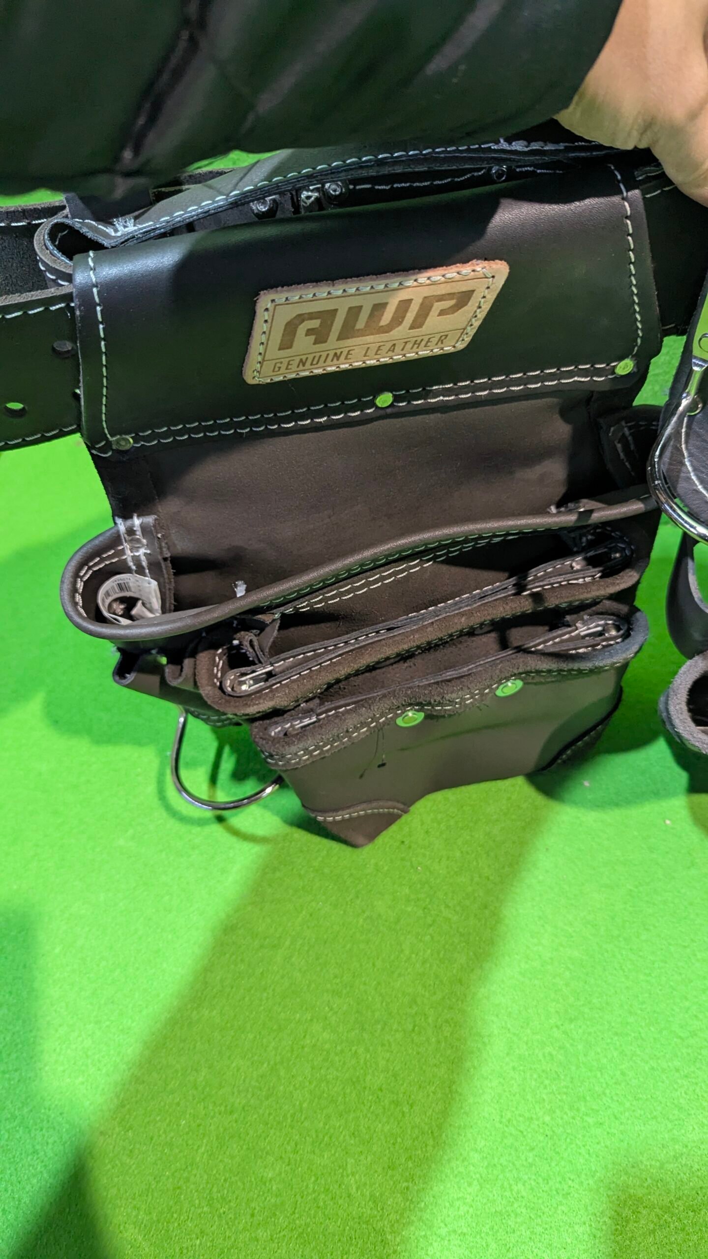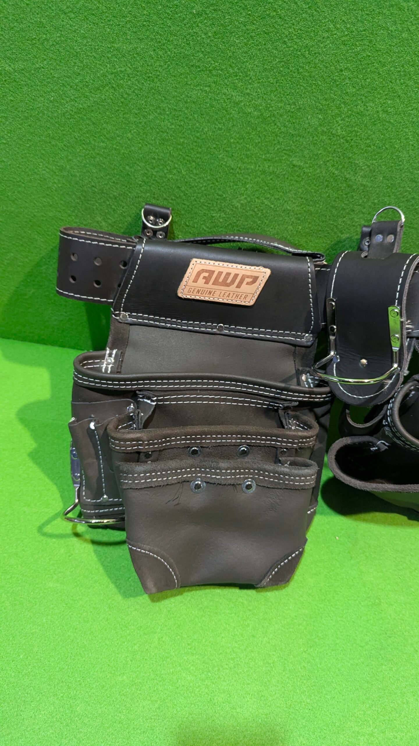 • El aparejo de herramientas de cuero curtido al aceite AWP cuenta con tecnología patentada TrapJaw en dos de los bolsillos. TrapJaw se abre para proporcionar un fácil acceso y cierre a presión para asegurar pequeñas herramientas y cierres en el interior